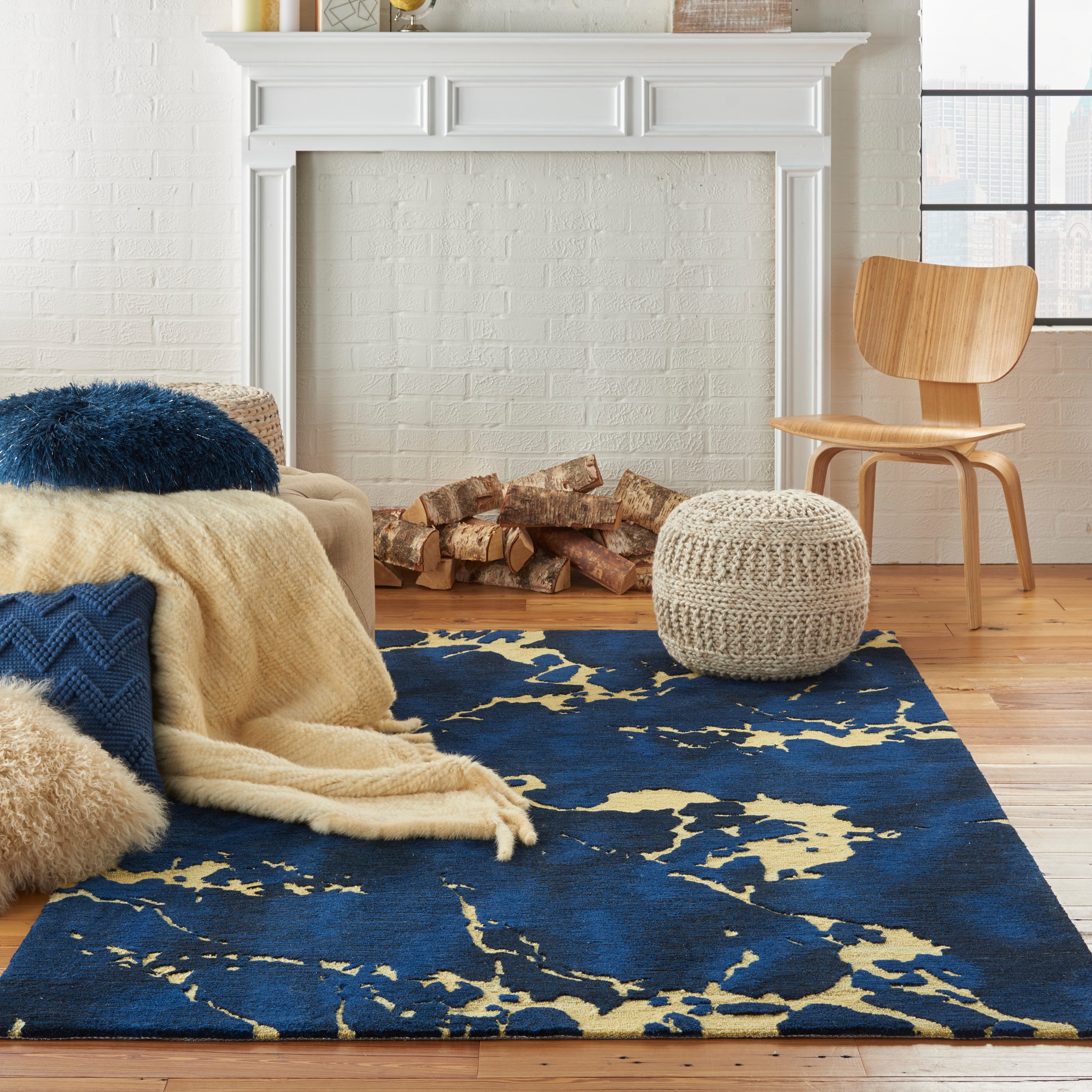 Elevate your home decor with the Symmetry SMM09 Navy rug from Nourison's striking Symmetry Collection. This contemporary textured rug boasts eye-catching abstract designs and a sophisticated color palette that ranges from neutrals to bold contrasts. The intricate cut-and-loop pile is expertly hand-tufted from easy-care fibers, making it both stylish and practical for everyday use.