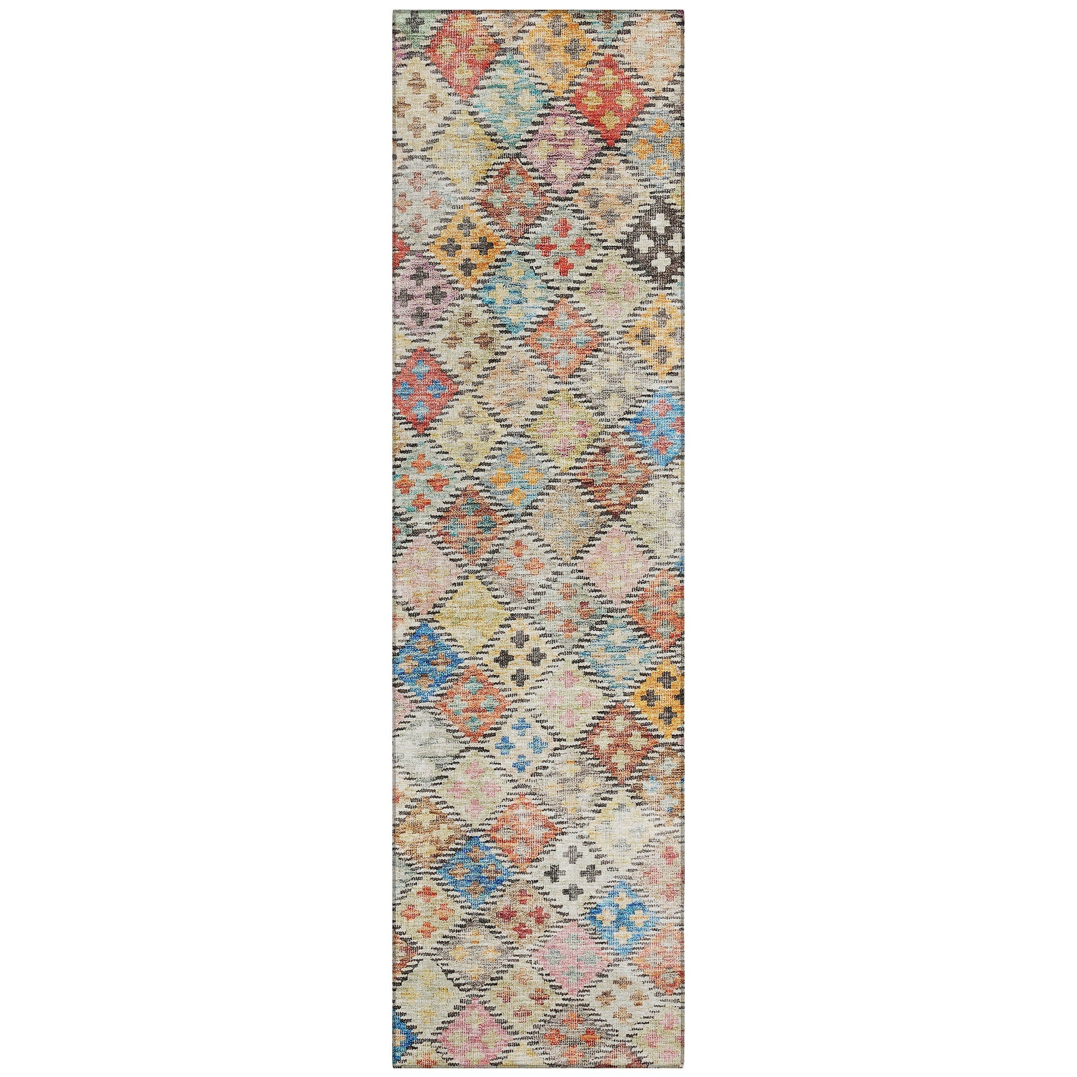 Introduce a touch of geometric sophistication with our area rug, boasting a diamond pattern filled with small cross motifs. This transitional design not only elevates the room but is also practical, featuring UV stabilization for both indoor and outdoor use. Its ultra-thin construction allows for placement in any space, and it’s machine-washable, ensuring ease of care for families and pets.