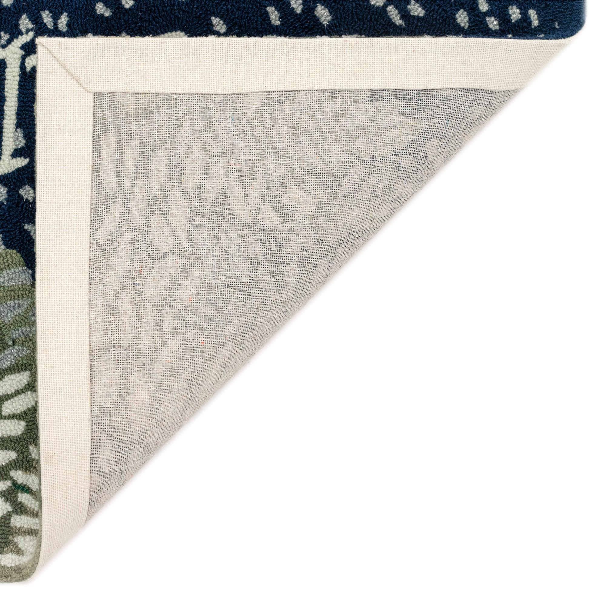 Frontporch Let It Snow Navy door mat, perfect for welcoming guests with a touch of winter charm. This serene design captures the essence of a peaceful snowfall against tranquil winter trees. Hand hooked using weather-resistant fibers, this collection offers a mix of comfort, softness, and durability.