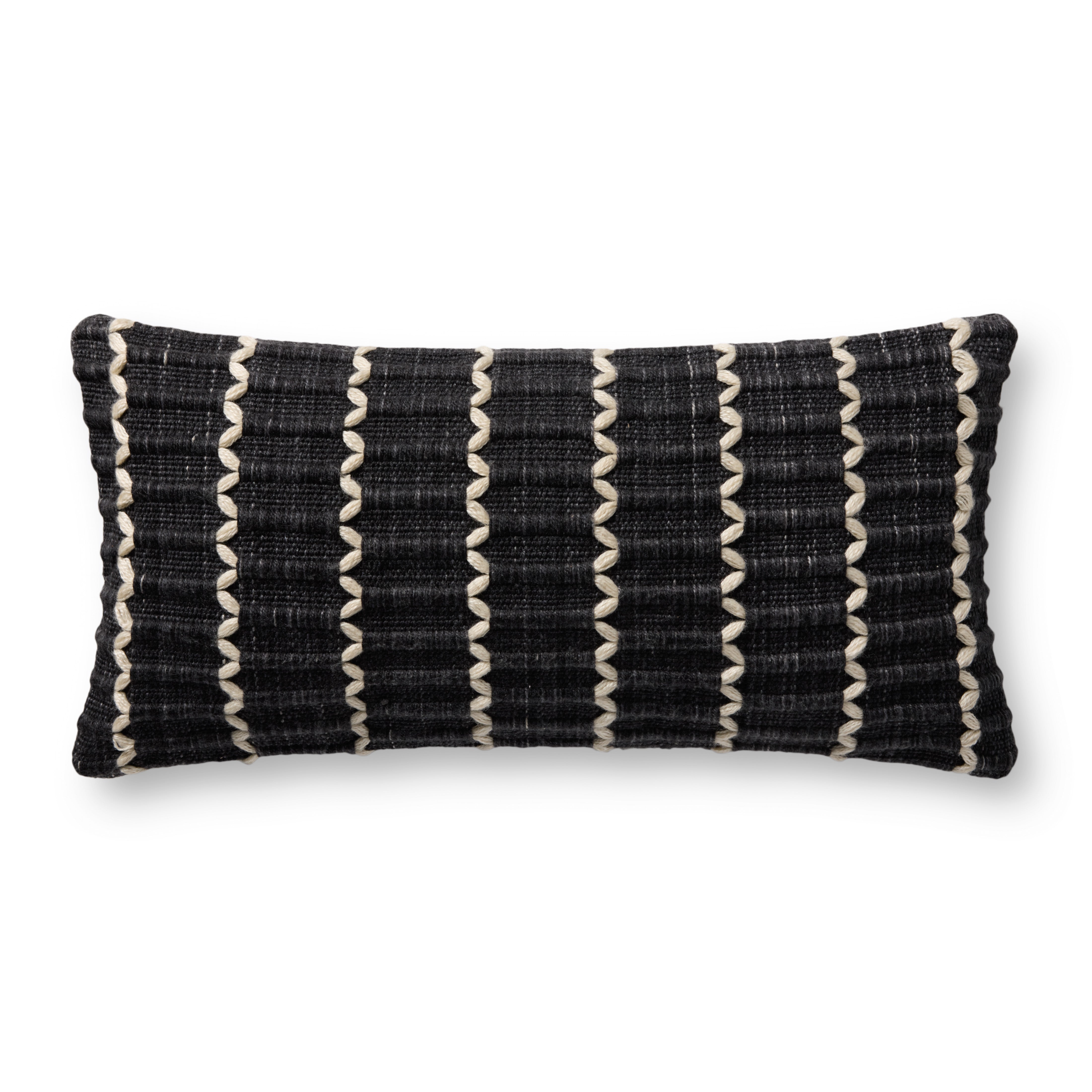 This black-and-white throw pillow features a block print-inspired geometric design in rich tones for living rooms, bedrooms, and more. The 12” x 27” lumbar pillow is hand-loomed in India of soft yet durable polyester.