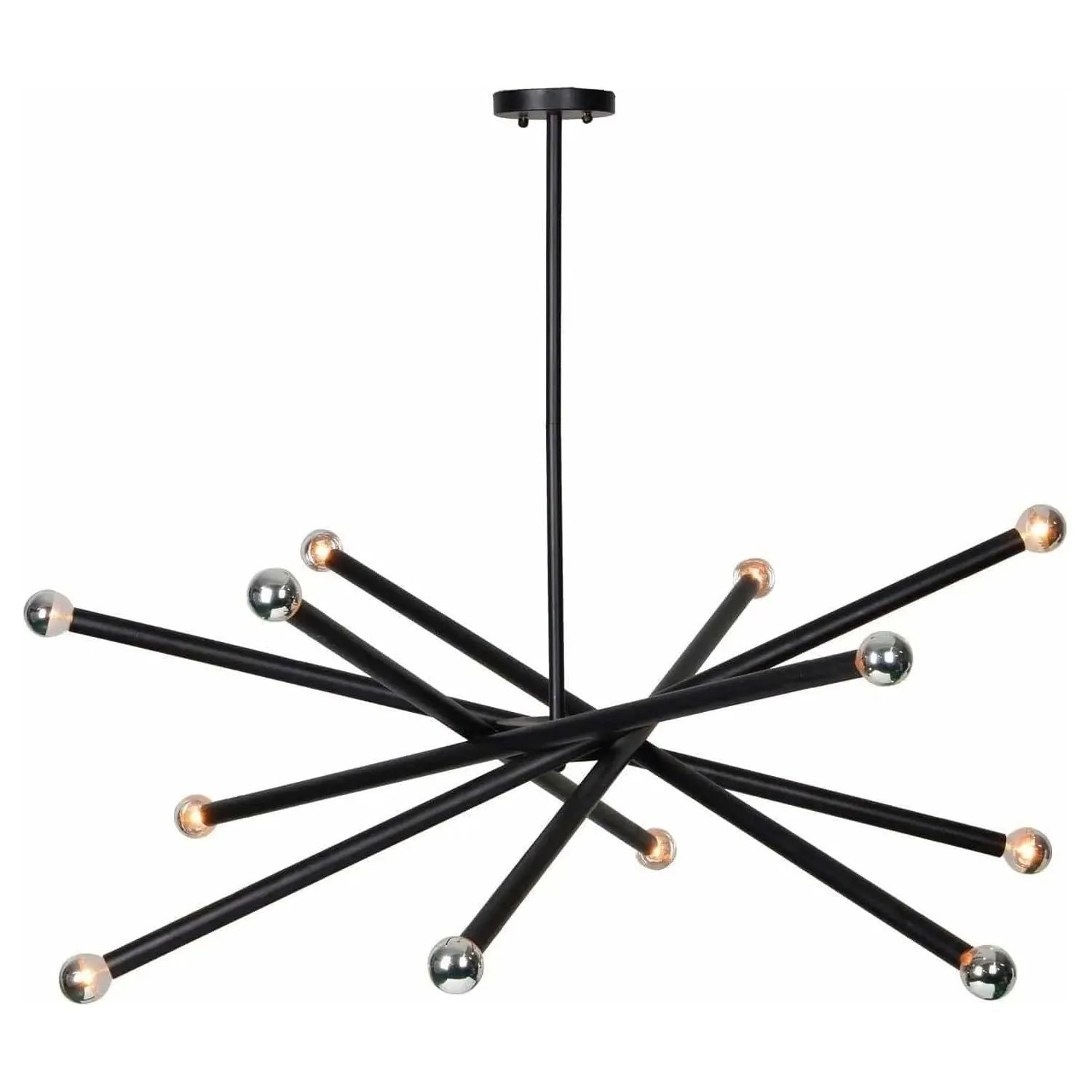 Artful arrangement and an unconventional silhouette give this modern ceiling pendant light major glamour. Six Matte black metal canes are suspended from a single stem in a crisscrossed pattern that’s anything but ordinary. A single bulb at the end of each black metal baton features a soft globe of light partially obscured by a sparkling silver shade. The debonair design of this decorative light fixture adds instant character to classic and contemporary spaces.