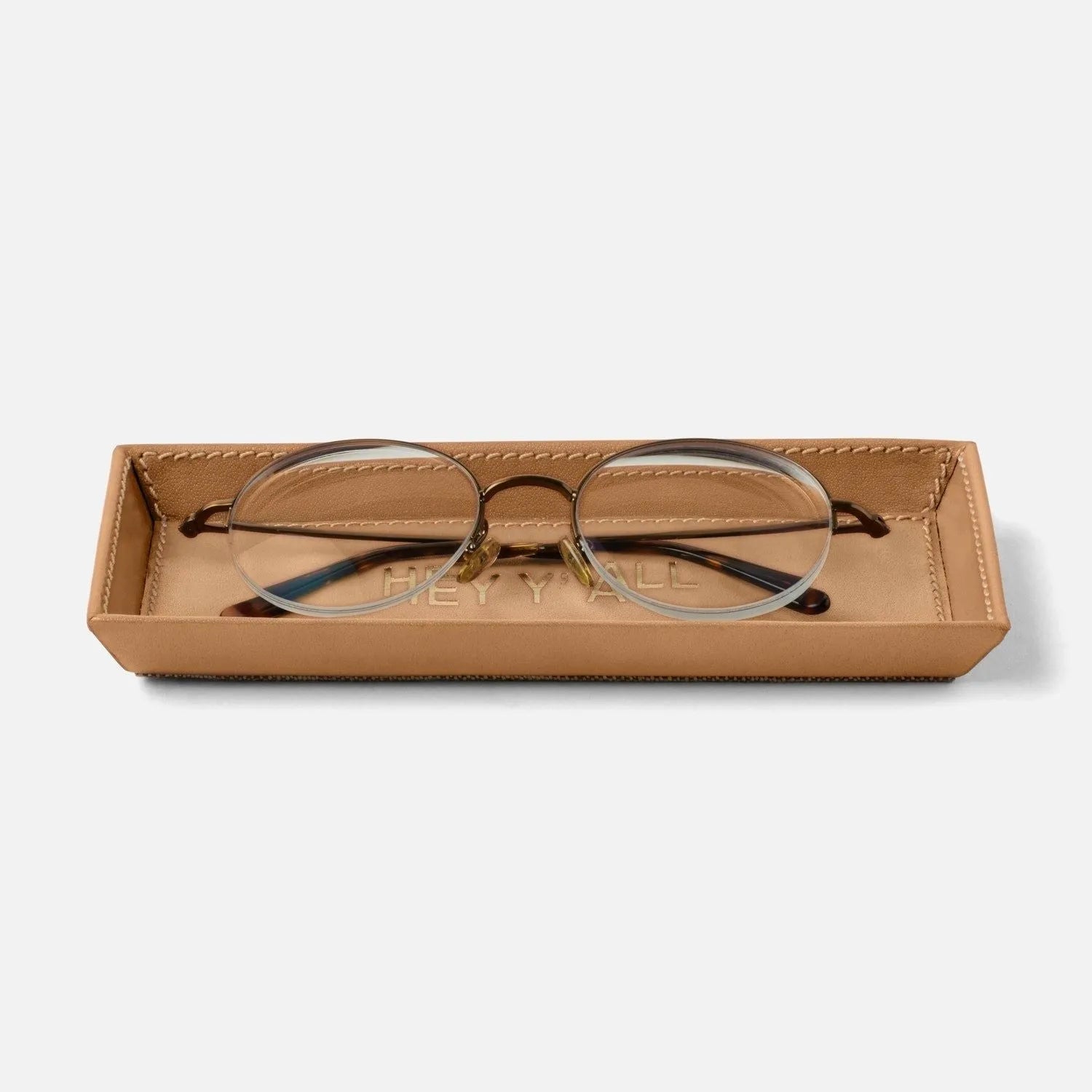 Our Decorah eyeglass holders and desk trays are crafted from opulent full-grain leather–now available in new colors and inspirational sayings.