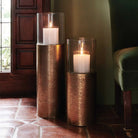 Dramatic, elongated base elevates the glamour of the antiqued Brass Ismay hurricane with hammered texture. Glass inserts included.