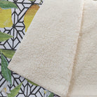 Introduce a zestful vibe to your kitchen decor with vivid lemons set against a geometric backdrop, radiating warmth and charm. The oversized 50" x 70" dimensions provide expansive coverage, enveloping you in luxury with a soft-touch front and cozy sherpa backing. Expertly crafted from fade-resistant polyester microfiber, it's ideal for both indoor and covered outdoor environments, ensuring longevity and ease with its machine-washable nature.