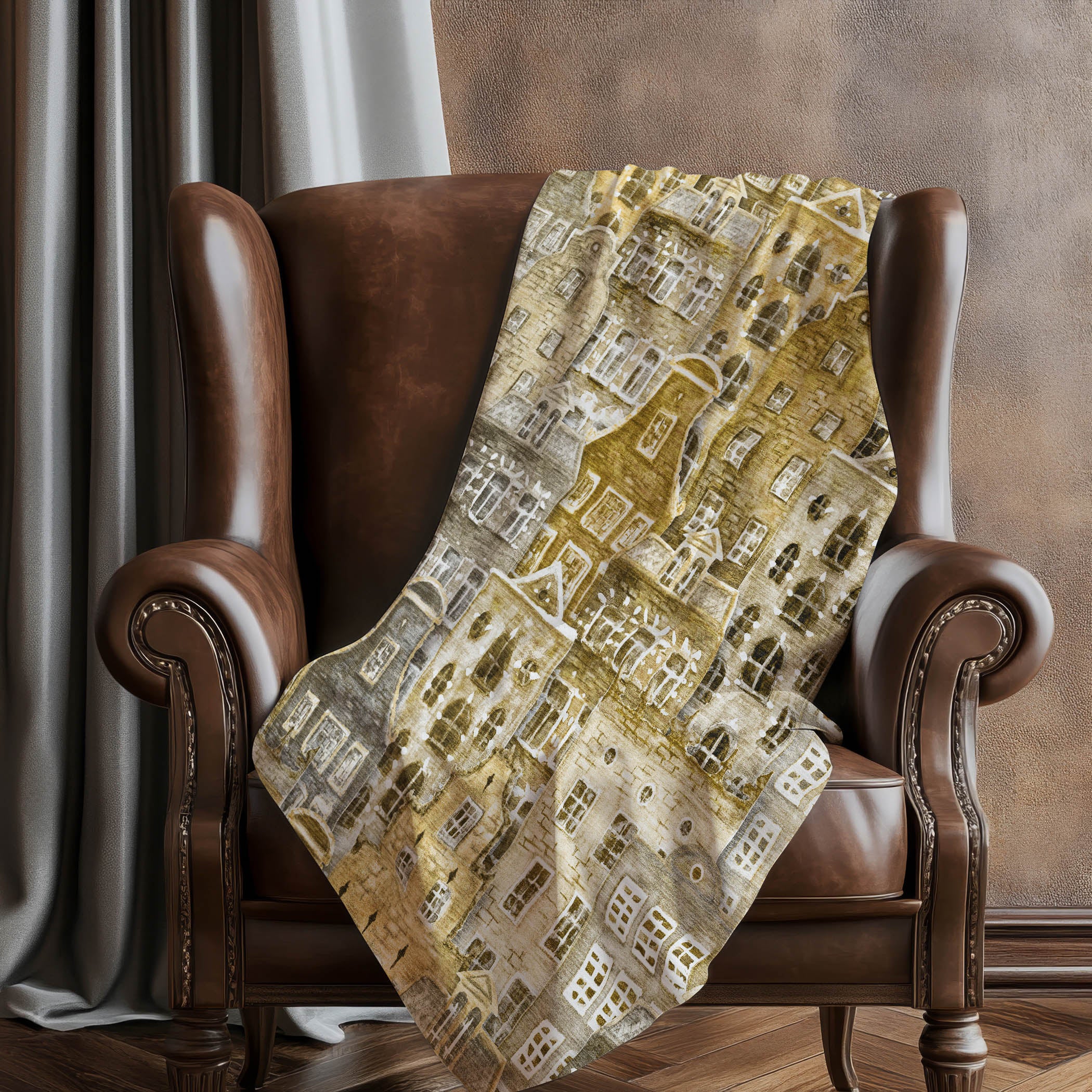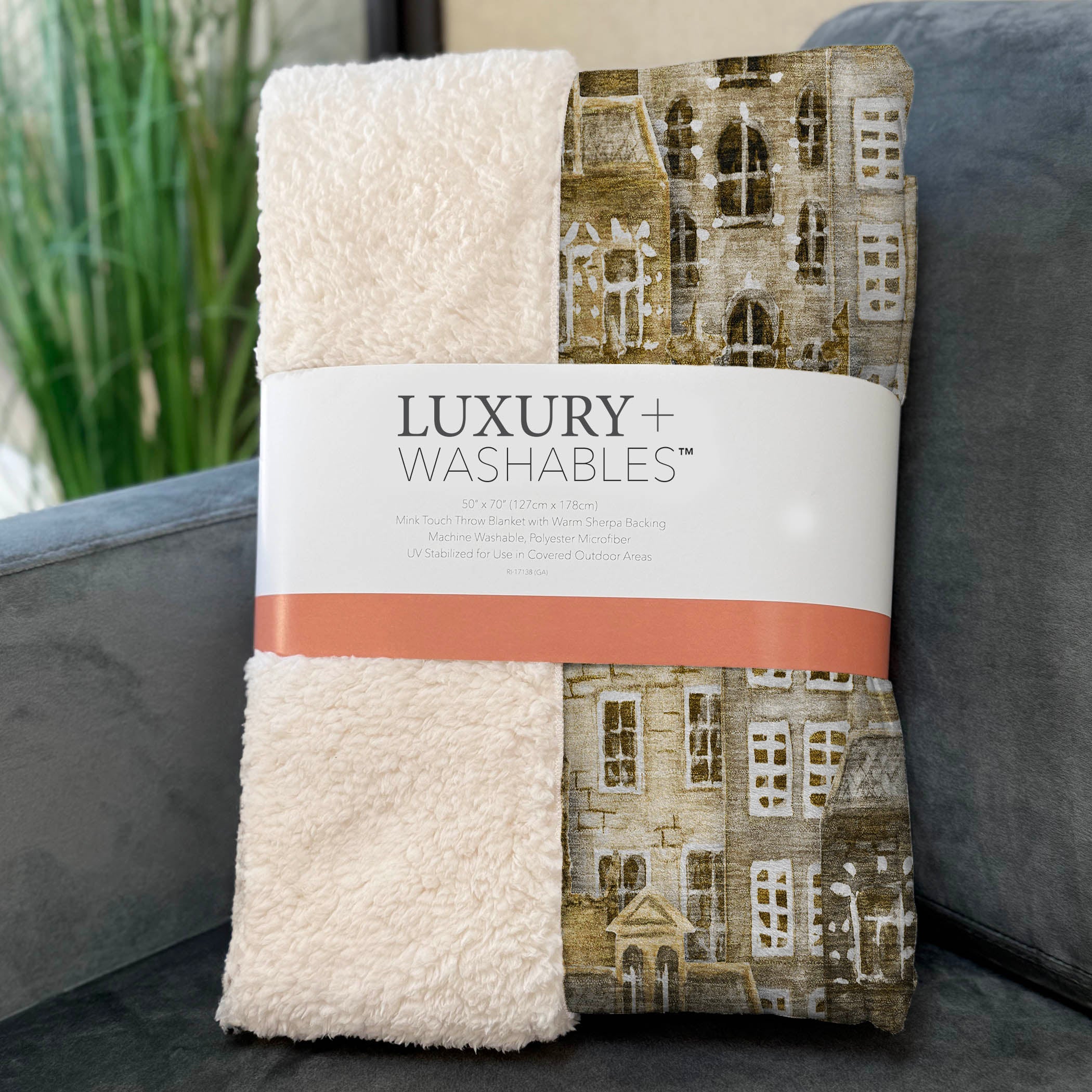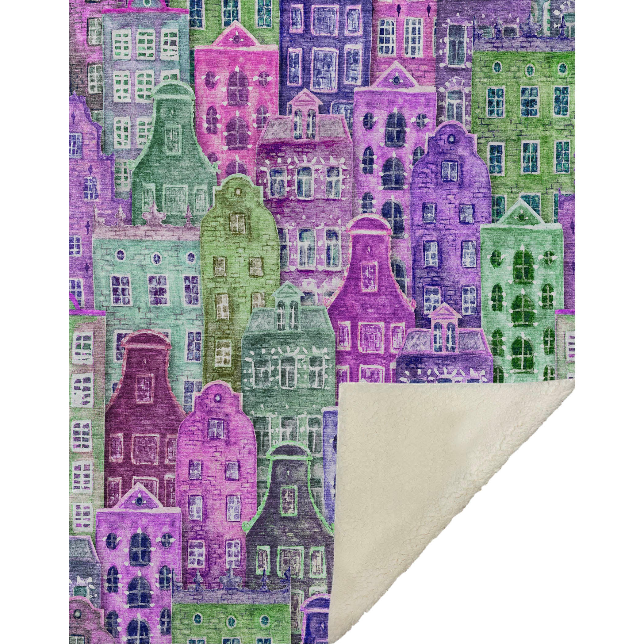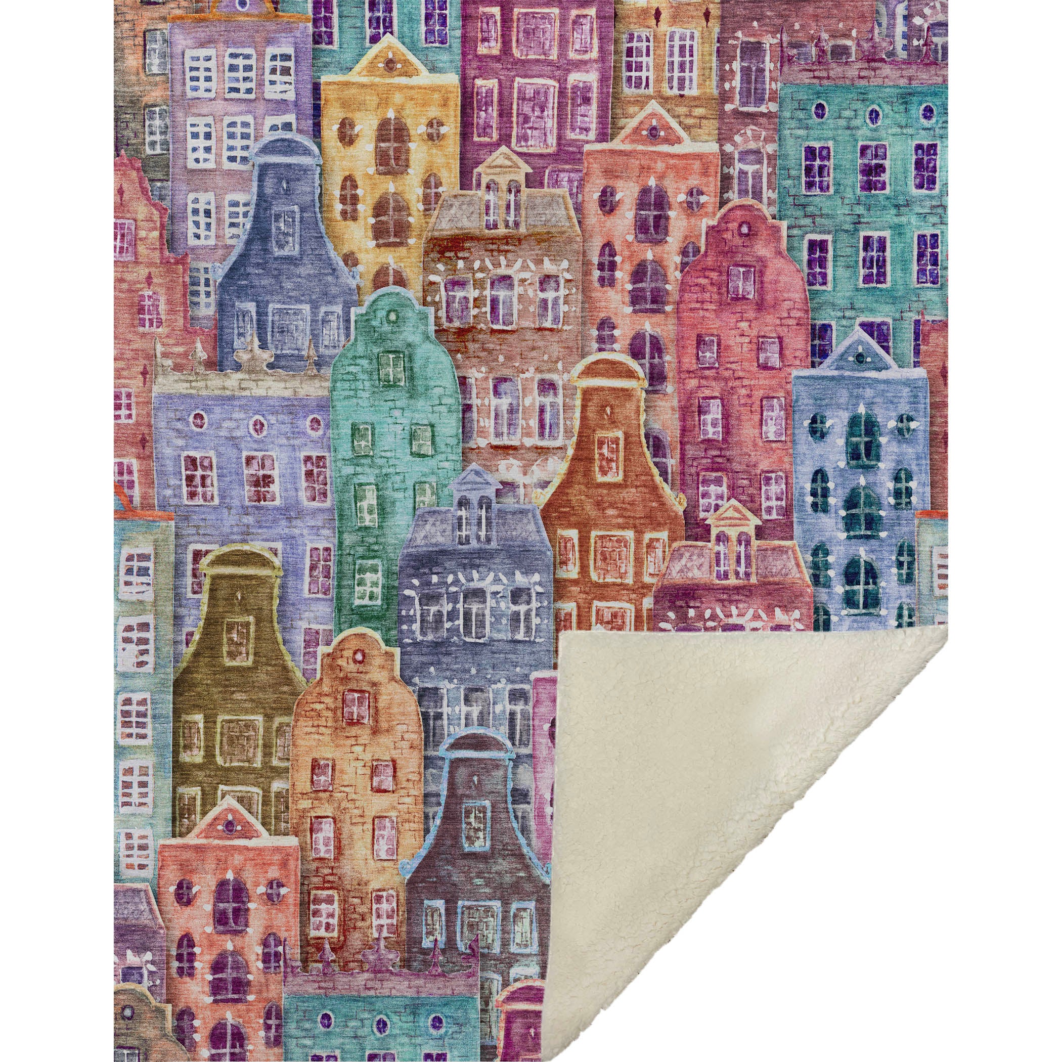 Charming and whimsical, this transitional-style throw brings the inviting allure of a quaint village into your home with its delightful novelty pattern of narrow houses. Oversized at 50" x 70", it offers a luxurious soft-touch front accompanied by a cozy sherpa backing, providing ample warmth and comfort. The fade-resistant polyester microfiber ensures durability for use both indoors and in covered outdoor spaces, while the premium machine washable feature simplifies upkeep for effortless care.