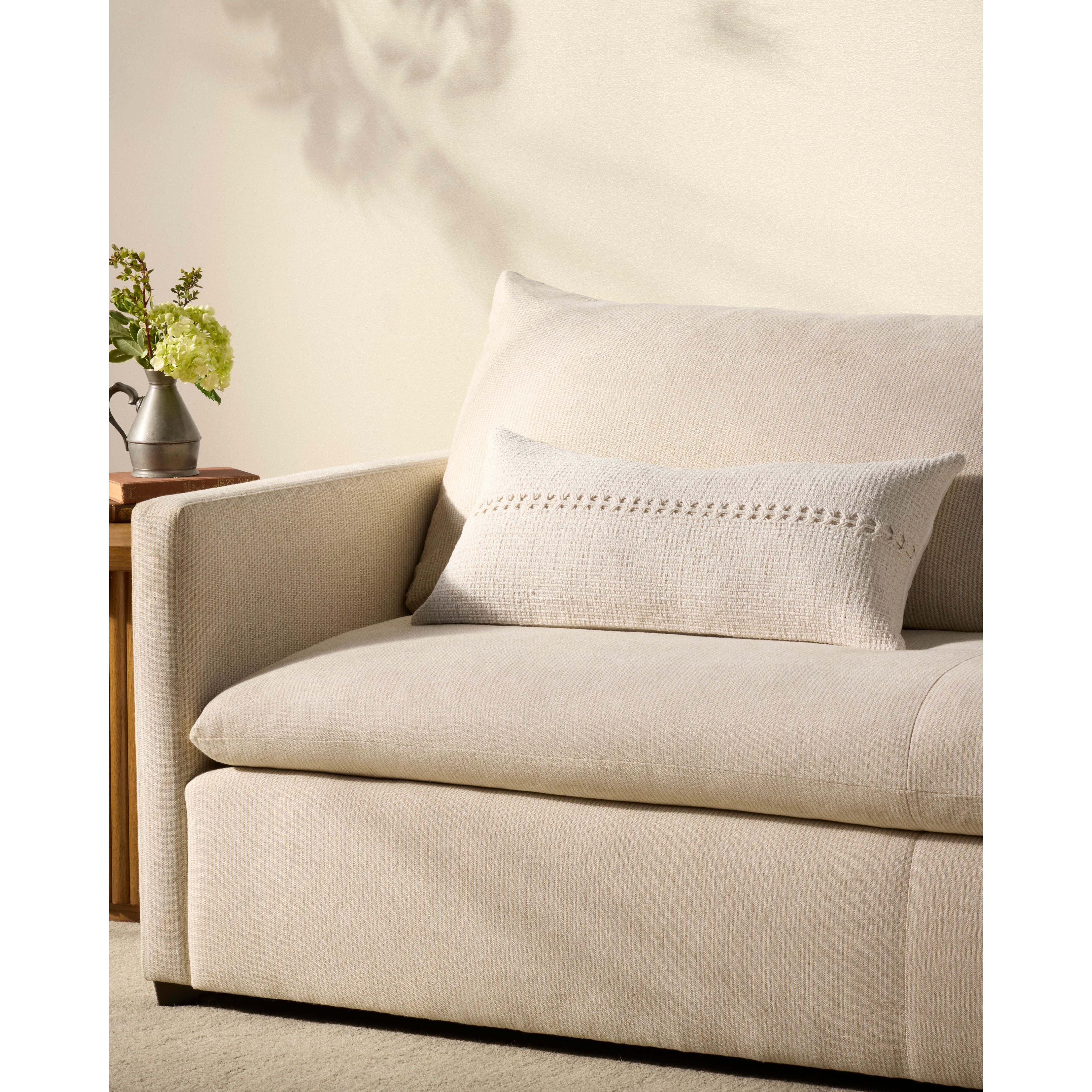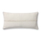 Harvey is a neutral ivory throw pillow from Chris Loves Julia x Loloi with a textured, woven stripe across its center. The pillow cover is made of 100% cotton and measures 12” x 27”, an elongated lumbar size to style in living rooms and bedrooms.
