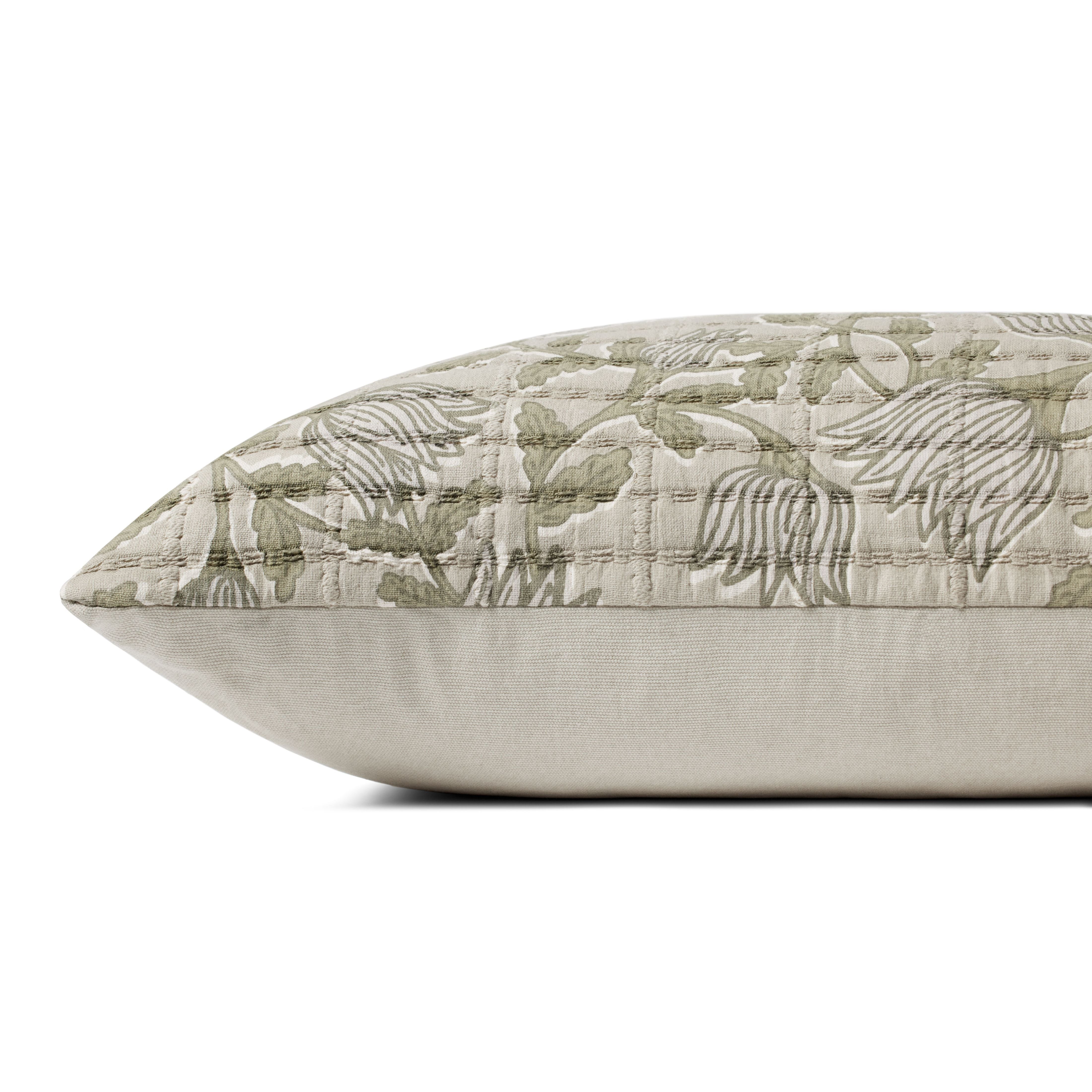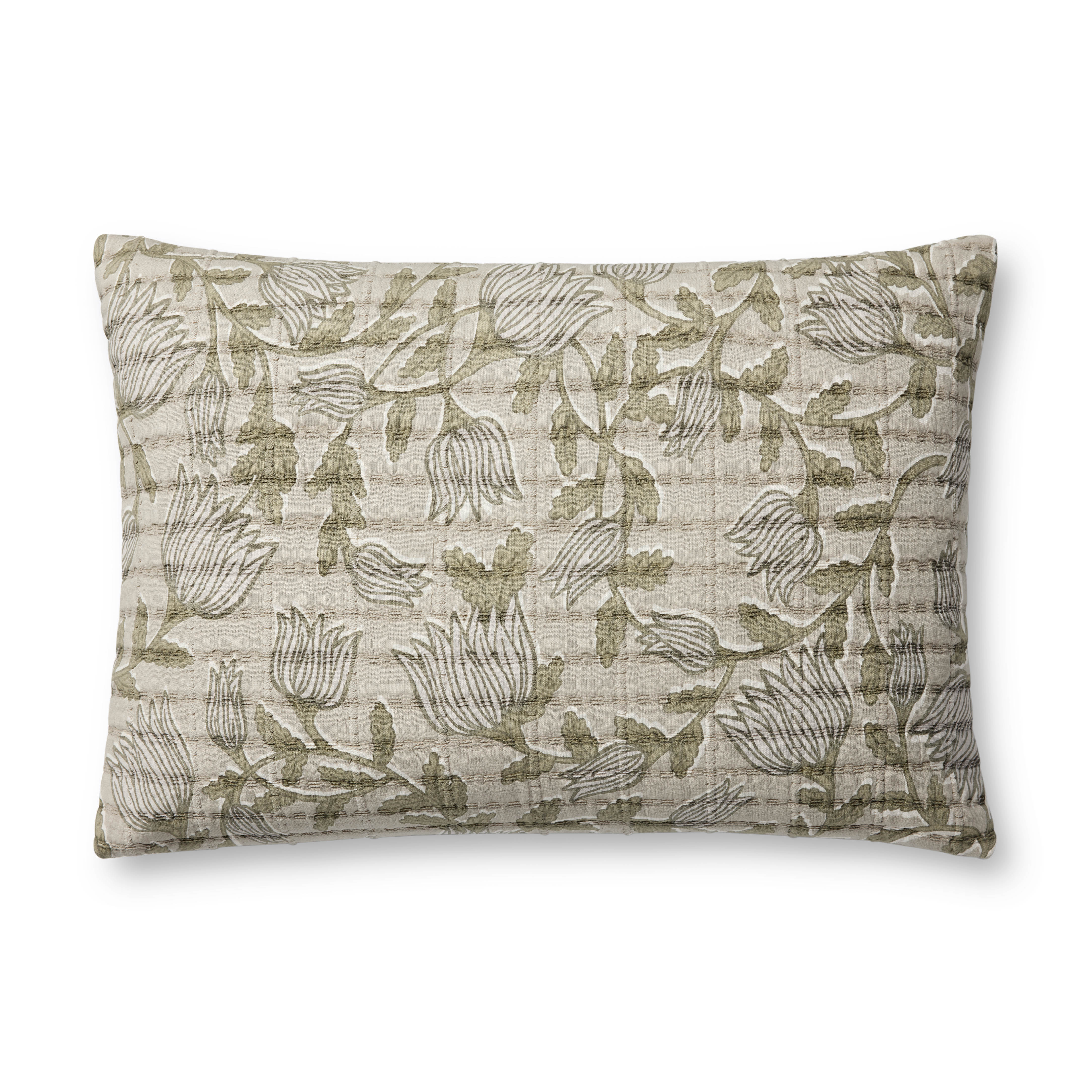 This elegant throw pillow from Jean Stoffer x Loloi features a sage and ivory floral pattern with a soft quilted texture. The pillow cover is made of cotton and measures 16” x 26”, an inviting, larger size to style in living rooms and bedrooms.