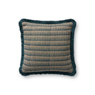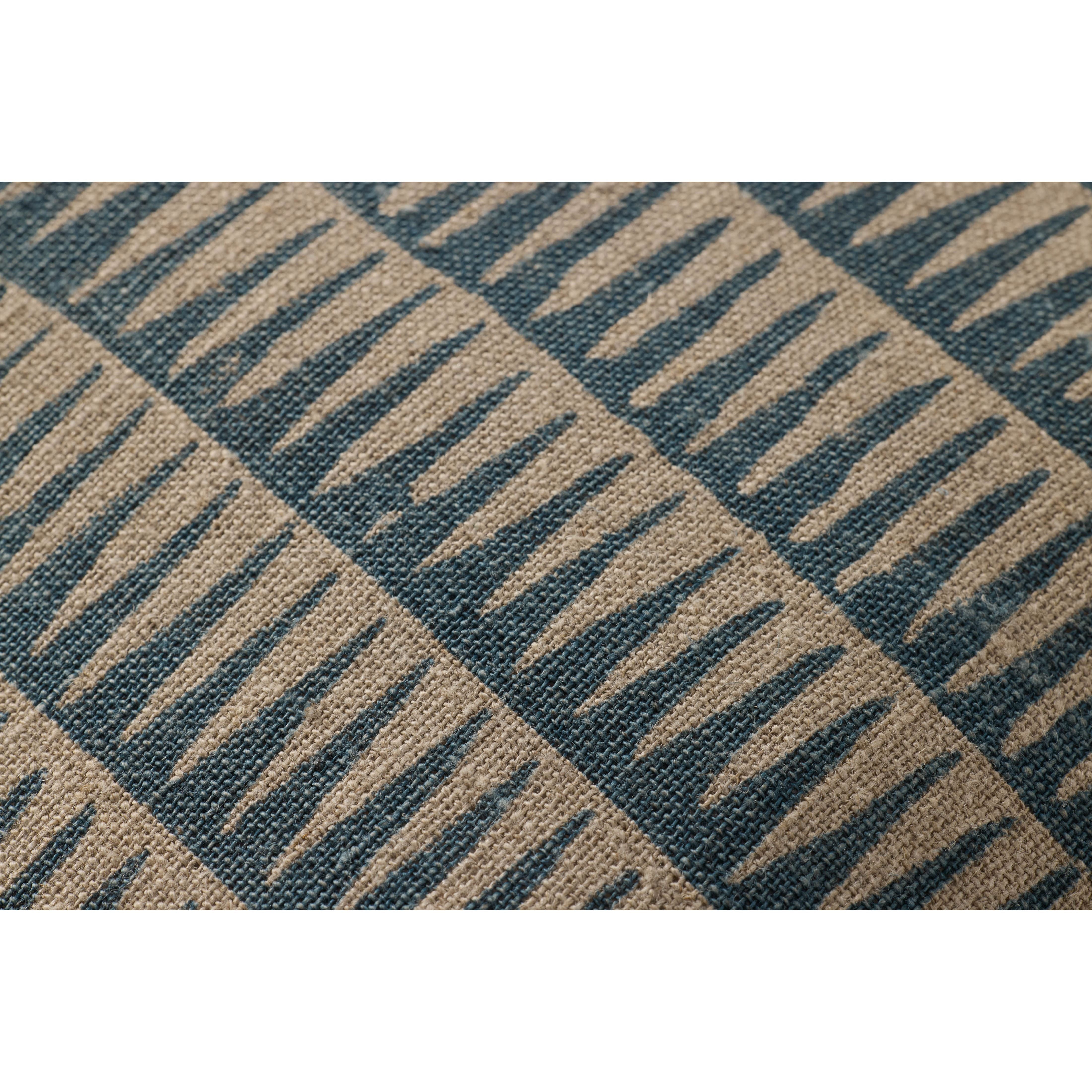 This linen throw pillow features a blue abstract design with soft fringe edges for boho, coastal, or organic home decor. The 18” x 18” square pillow is woven in India of 100% linen with cotton fringe.