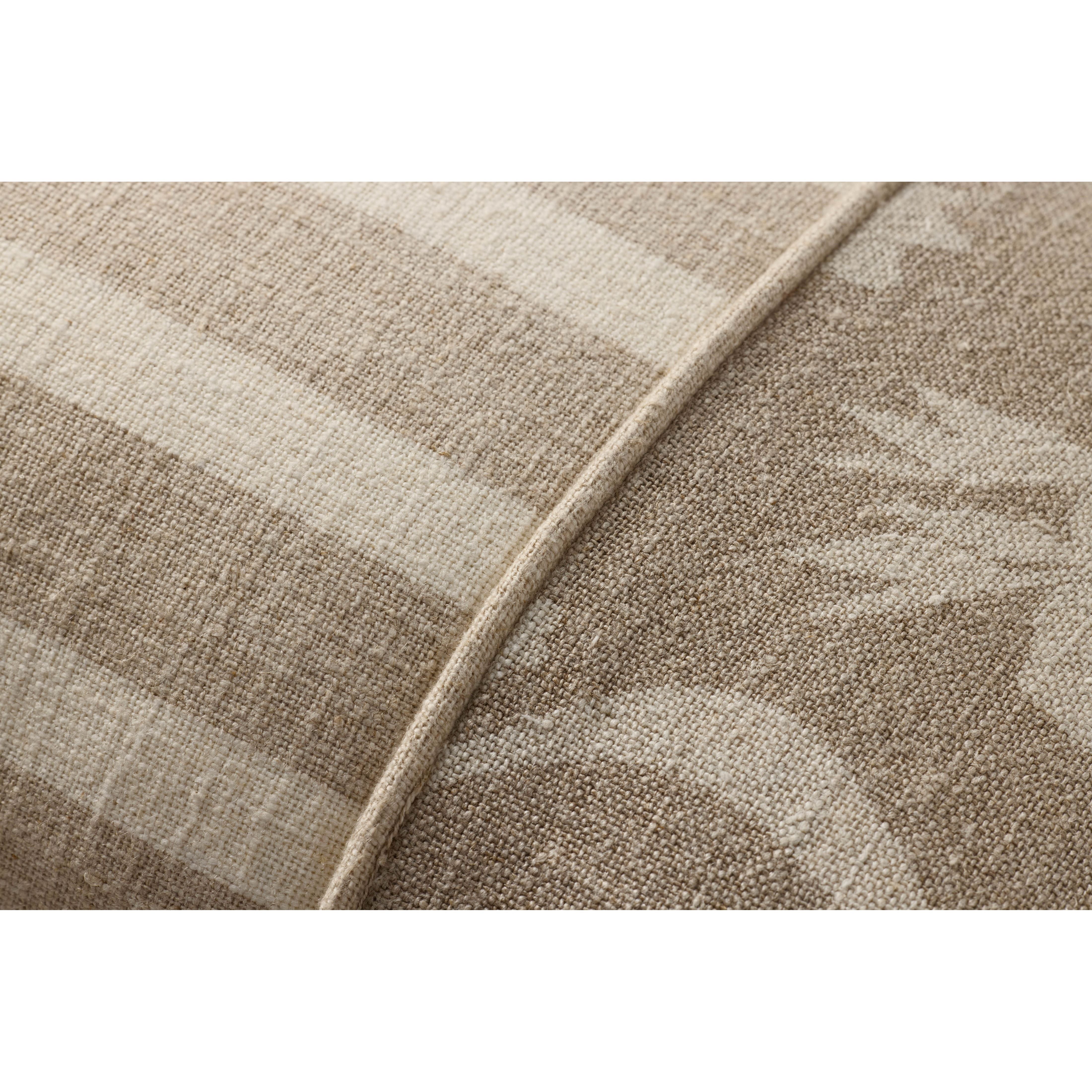 This linen throw pillow features an elegant white floral and stripe design with double flange edges for farmhouse, coastal, or organic home decor. The 13” x 21” lumbar pillow is woven in India of linen and cotton.