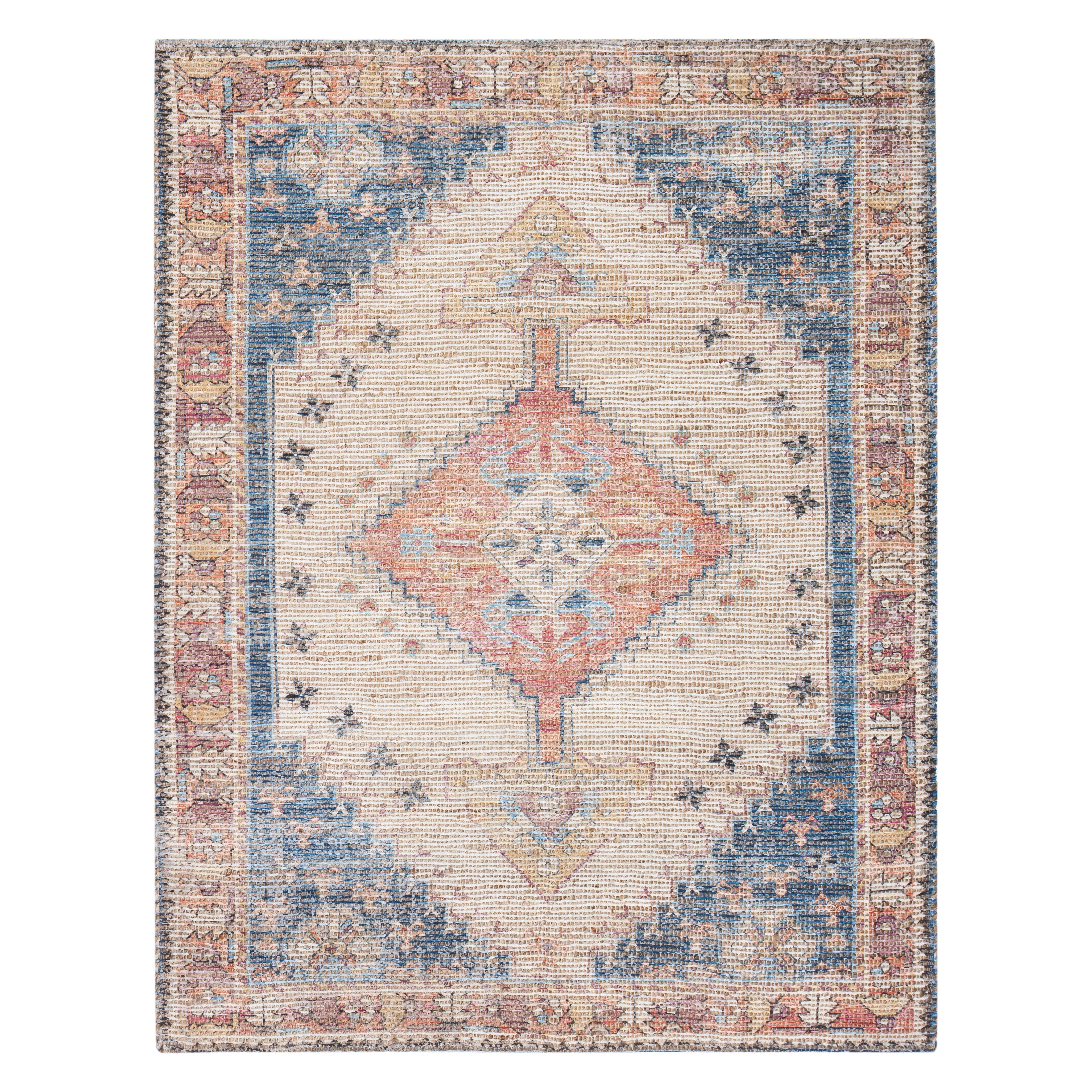 Beso Distressed Red area rug, a stunning addition to any home decor. Handmade with warm neutral tones of beige, blue, and red, this rug effortlessly infuses global style into your space. The natural jute material adds a rugged texture that is beautifully handwoven into a flatweave design. Featuring subtle Persian-inspired patterns, this rug exudes an heirloom quality achieved through a distressed digital printing process. Not only does it enhance the aesthetic of your room, but it also provides durable floor protection for long-lasting use.