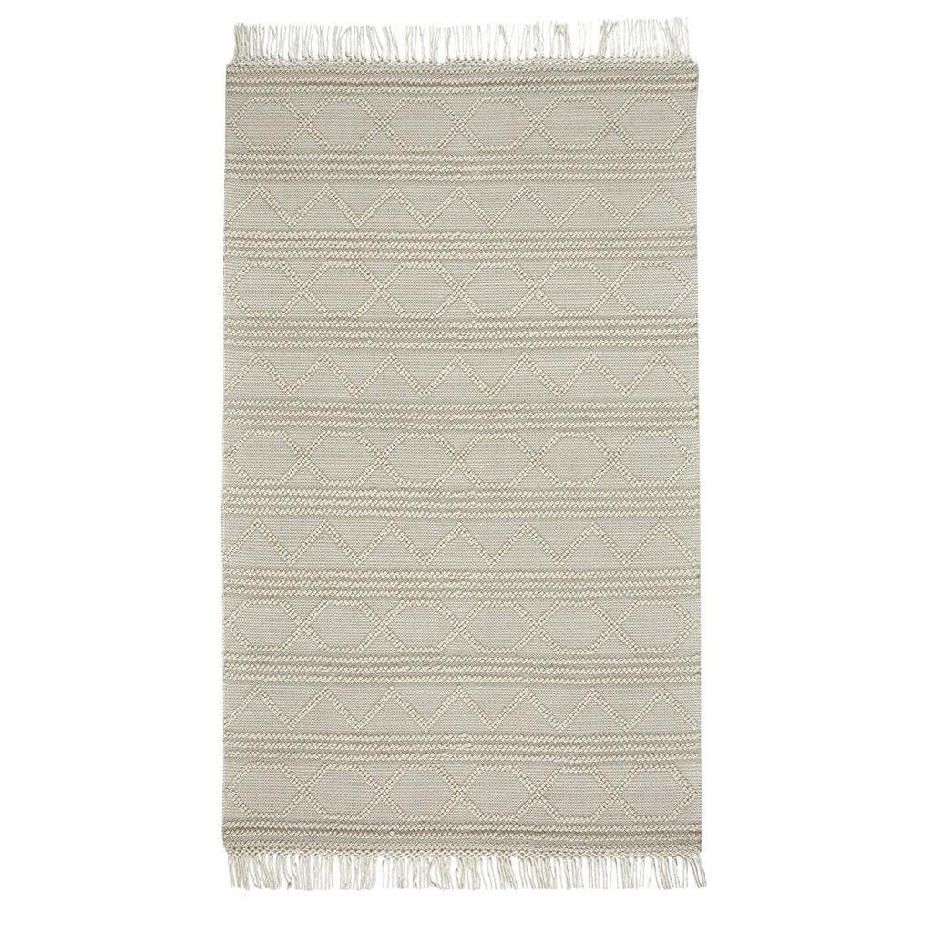 Darius Buff collection, a modern take on traditional tribal rugs originating from India. Crafted from hand-woven wool in soothing neutral tones, these rugs feature a striking high-low texture that captivates the eye. The addition of a substantial fringe detail lends an artisanal touch, evoking the charm of macramé wall hangings.