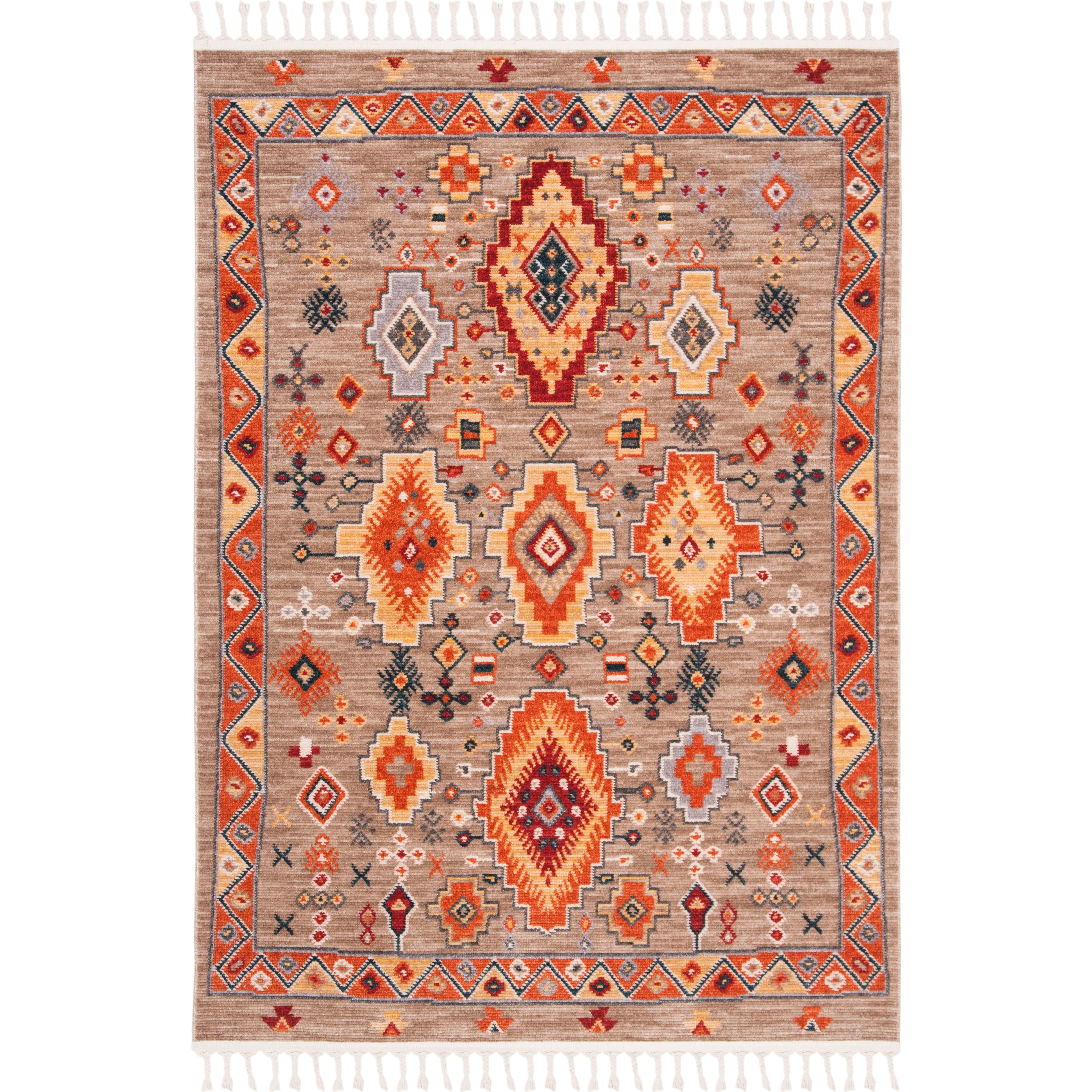 Elevate your space with the Farmhouse 800 FMH848E Taupe Orange rug, blending modern farmhouse charm with bohemian flair. Featuring braided tassels and a palette of blue, orange, yellow, and red, this rug exudes a stylish vibe inspired by traditional southwestern colors. Crafted with a super smooth polyester pile, it's perfect for layering on top of a natural fiber rug or as a standalone piece in your living room, bedroom, or dining room. With an approximate thickness of 0.25 inches, this rug effortlessly complements any furniture arrangement.