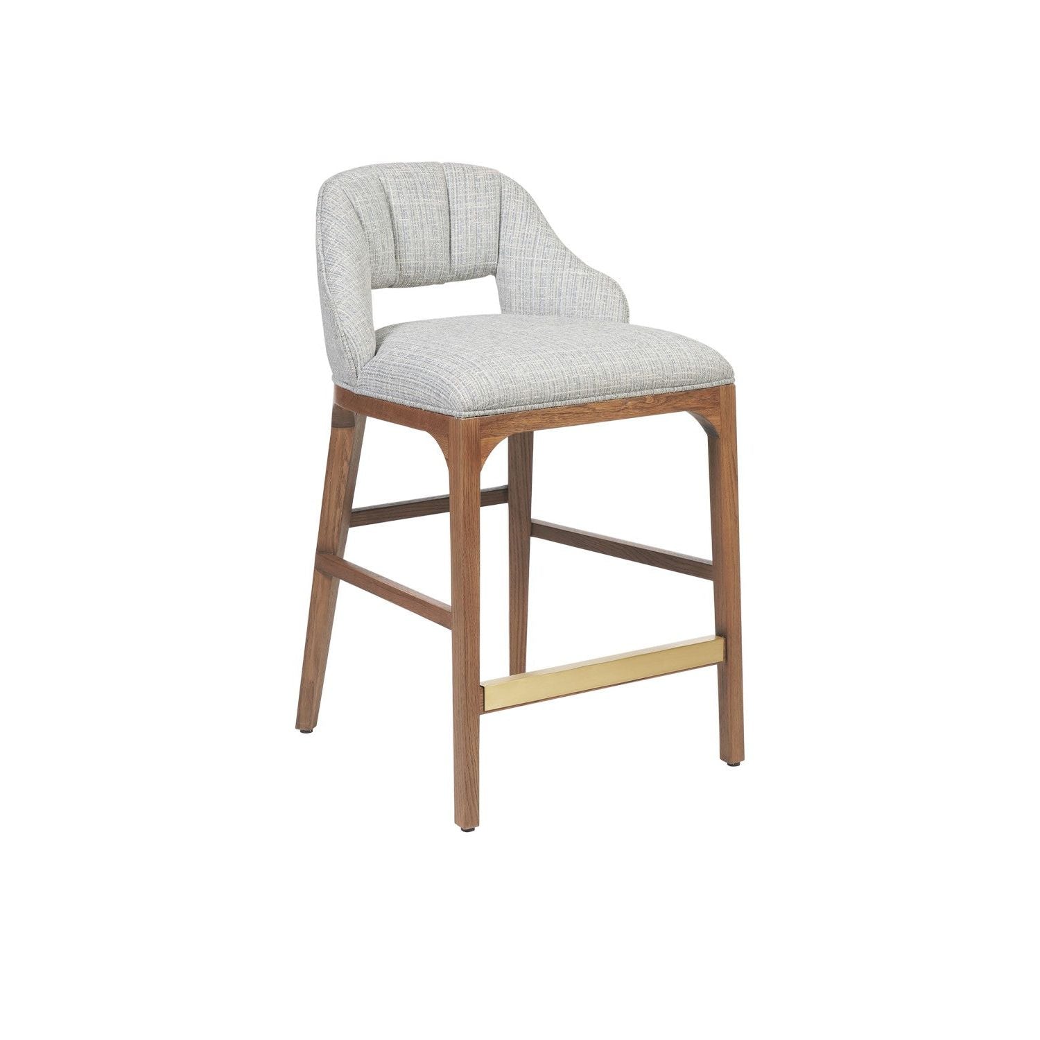 The Inga Counter Stool covered in a Greenlight Powder fabric has an upholstered back and seat that sits nimbly atop a solid oak frame in a morel brown finish. The paleness of the fabric and the warmth of the wood create a soft contrast, while the brass kick-plate brings a bit of brightness to the design.