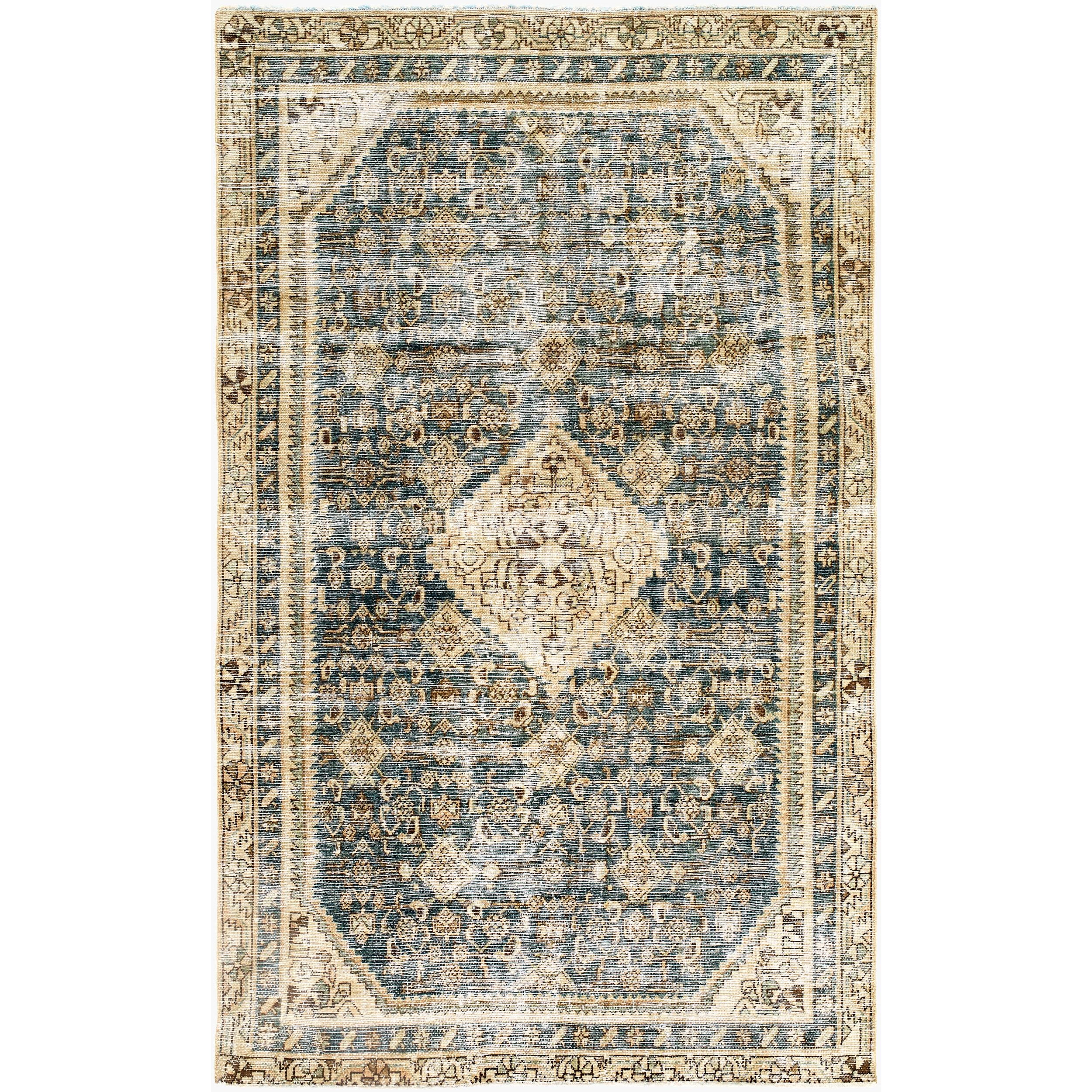 Detailed Colors: The prominent colors in the rug are: 'Teal, Ivory, Sandstone, Charcoal, Slate Blue'