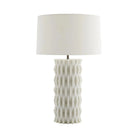 Inspired by modern Parisian architecture, the Nago's design is full of dimensional pattern and detail. The ivory rice stone construction features a deeply tactile, zig-zag design of layered rice stone shingles. Topped with an off-white linen drum shade with off-white cotton lining and a bronze sphere finial. Finish will vary.