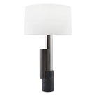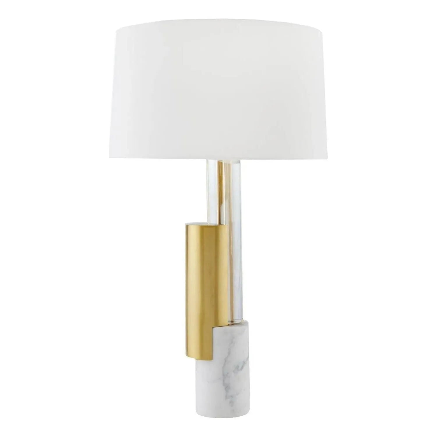 A brilliant mix of forms and materials unite in the Pepperdine lamp. The piece is created in a column of stacked, offset cylinders of champagne crystal, white marble and antique brass steel, or smoke crystal, black marble and bronze steel. The artful table lamp is finished with an off-white microfiber drum shade lined in off-white cotton. Finishes will vary.