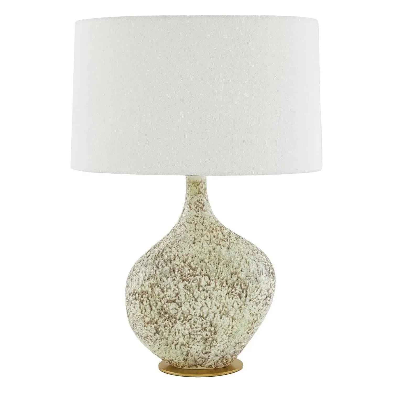 Our Stillwater lamp, in moss reactive ceramic takes on an asymmetrical, handmade form of glazed pottery. The gestural table lamp rests on a steel base finished in antique brass and is accented with a matching finial. An off-white, oval linen drum shade, lined in off-white cotton, completes the look. Finish will vary.