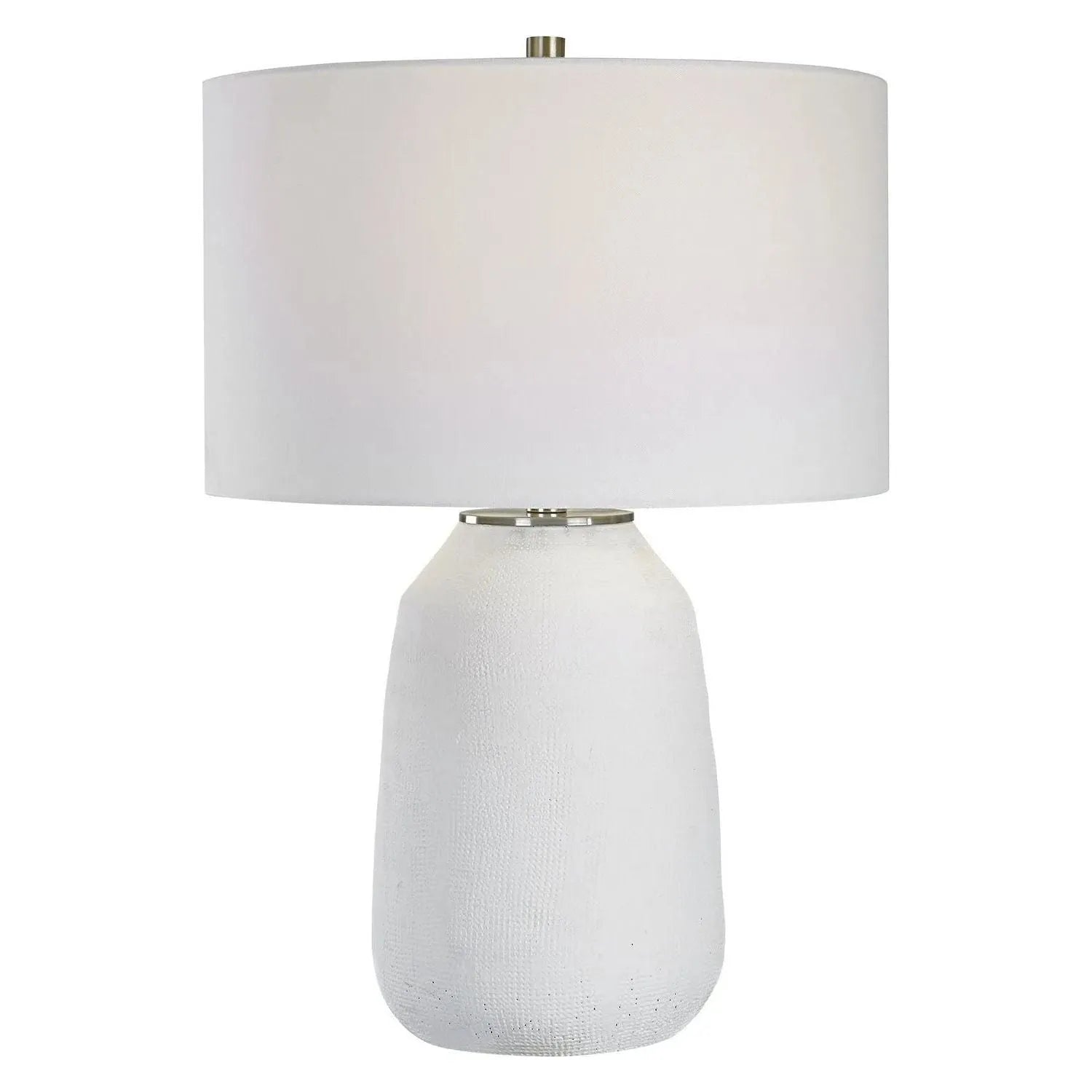 With Its Casual Ceramic Build And Chalk White Matte Finish, The Styling Possibilities For This Table Lamp Are Virtually Endless. All Steel Details Are Finished In Brushed Nickel. The Lamp Is Paired With A Hardback Drum Shade Covered In A White Fabric.