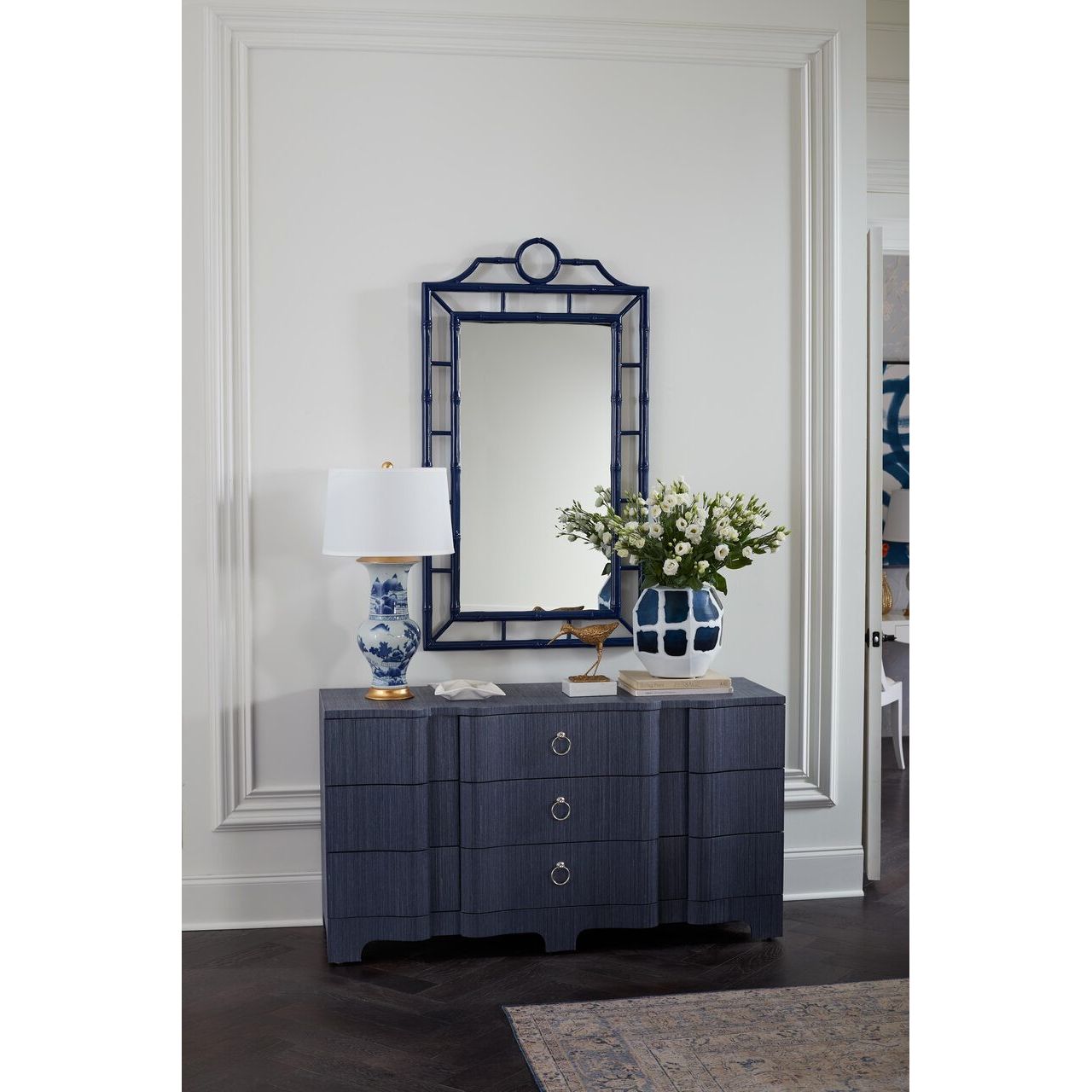 The Pavillion Lamp achieves the look of a priceless piece of pottery while illuminating a room—and capturing your imagination. Is it a centuries old antique or a wonderfully luxurious modern design? Villa & House’s artisans have a way of making you wonder. Of course, this freshly crafted piece is the result of their skillful handiwork. They’ve rendered a regal silhouette in high-quality ceramic, then hand-painted it in the blue and white scheme of traditional China. The artfully detailed scene is rich in movement and energy rooted in the natural world, featuring a flowing ocean, majestic mountains, floating clouds, and flying birds. It’s a work of art with functional appeal. Top with a classic lampshade and allow it to take the spotlight in any sumptuously decorated space in your home. Please note: Villa & House's lamp shades are sold separately. The Pavillion Lamp achieves the look of a priceless piece of pottery while illuminating a room—and capturing your imagination. Is it a centuries old antique or a wonderfully luxurious modern design? Villa & House’s artisans have a way of making you wonder. Of course, this freshly crafted piece is the result of their skillful handiwork. They’ve rendered a regal silhouette in high-quality ceramic, then hand-painted it in the blue and white scheme of traditional China. The artfully detailed scene is rich in movement and energy rooted in the natural world, featuring a flowing ocean, majestic mountains, floating clouds, and flying birds. It’s a work of art with functional appeal. Top with a classic lampshade and allow it to take the spotlight in any sumptuously decorated space in your home. This lamp is topped with a crisp white laminated linen shade, accented with brass hardware.