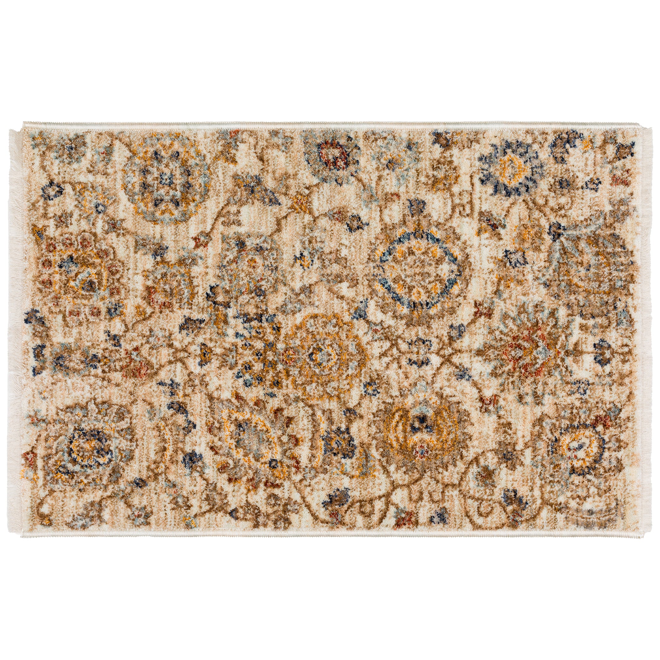 Bergama BE5 Ivory rug, a timeless piece that effortlessly combines classic, casual, and traditional styles for a sophisticated yet comfortable look. The intricate design is complemented by a short fringe that adds a touch of elegance while making maintenance easy. With fresh warm colorways, this rug brings a welcoming ambiance to any room, creating a cozy atmosphere. Crafted with a polyester pile, it offers luxurious softness underfoot and long-lasting durability. Elevate your home with this rug's perfect fusion of classic design, practicality, and warm hues that complement any decor seamlessly. Make a stylish and functional investment for your space today.