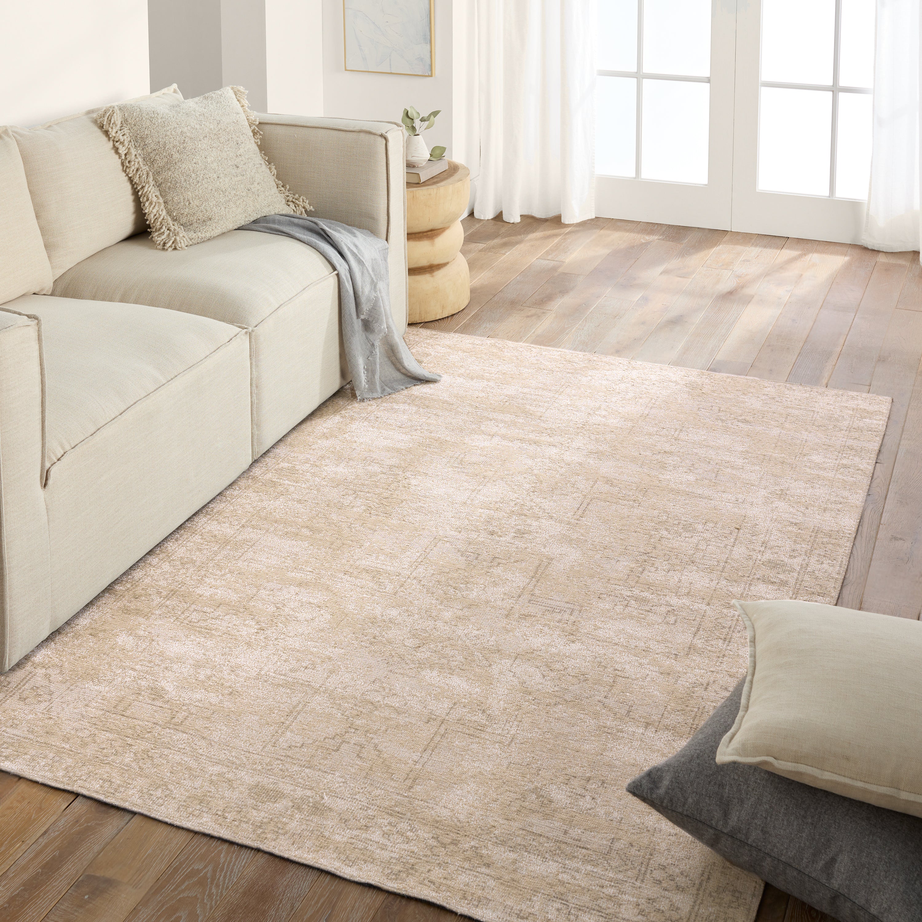 The innovative Edage rug collection showcases distressed, vintage designs, digitally printed onto a jute and polyester base. This process provides effortless texture and natural appeal through the jute weave, while maintaining an elevated feel through updated traditional patterns. The Tegona design showcases a dual center medallion pattern with geometric detailing in hues of tan and cream. This rug best suits medium to low traffic spaces of the home such as formal dining areas, bedrooms, formal dining areas, and sitting rooms.