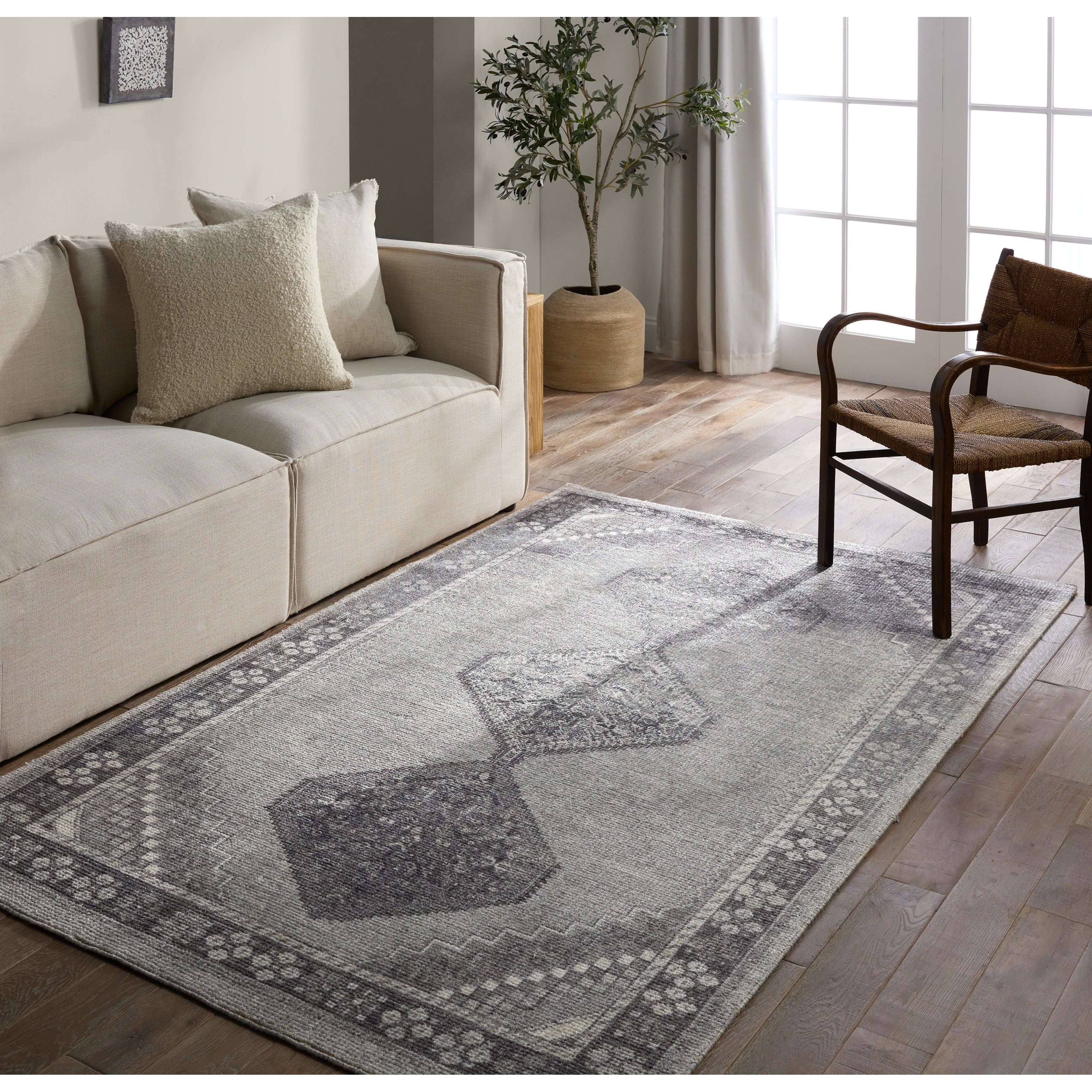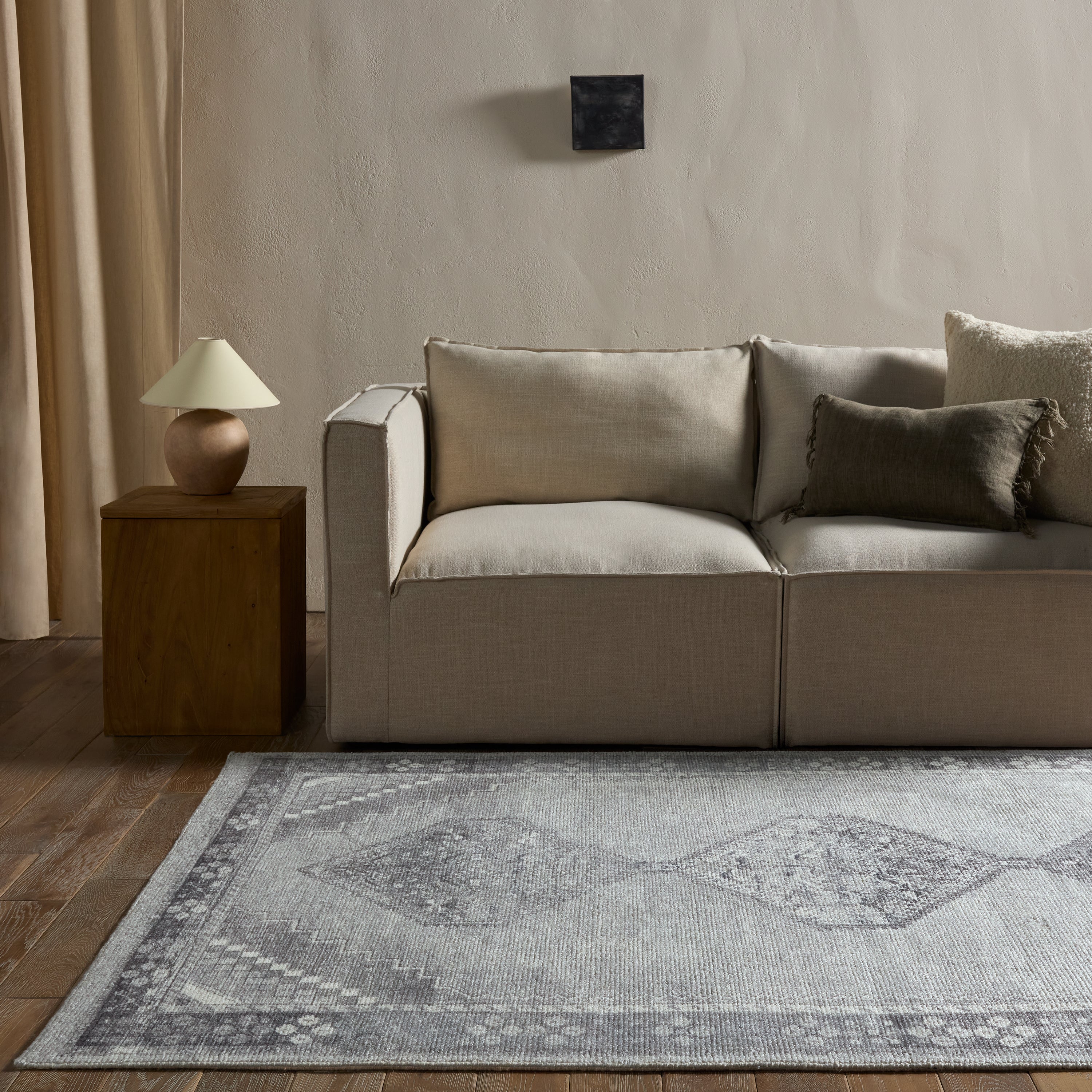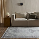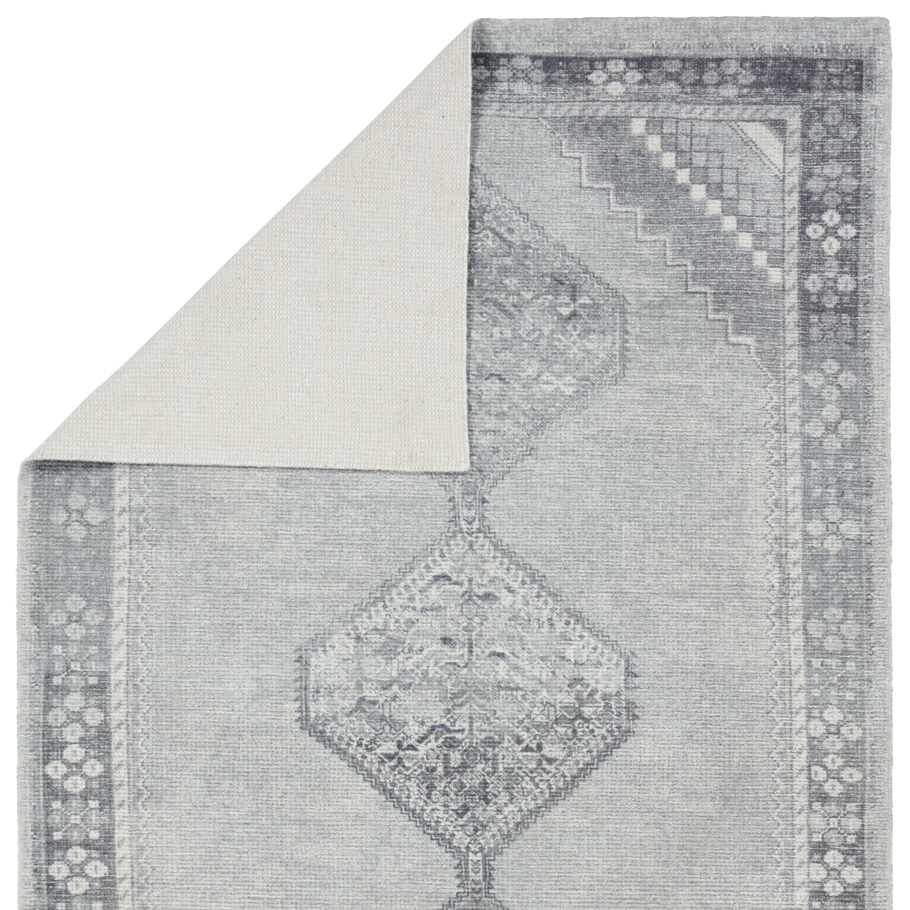 Nostalgic medallion motifs with a modern reinterpretation. The Theo collection features a vintage-inspired design complemented by rich yet distressed shades of blue and gray. A digital print is layered on a handwoven base, offering durability and easy care—with a luxe, high-end look.