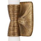 Sculptural and sophisticated, the Burrows Bath Wall Sconce is crafted from cast brass and features highly textured metal surfaces that mimic the look of flowing strands of hair swept into a tight bun. White glass globes extend from the top and bottom of the wallplate, forming a graceful hourglass silhouette. Standing at 24 inches tall, this two-light sconce is dimmable and damp rated.