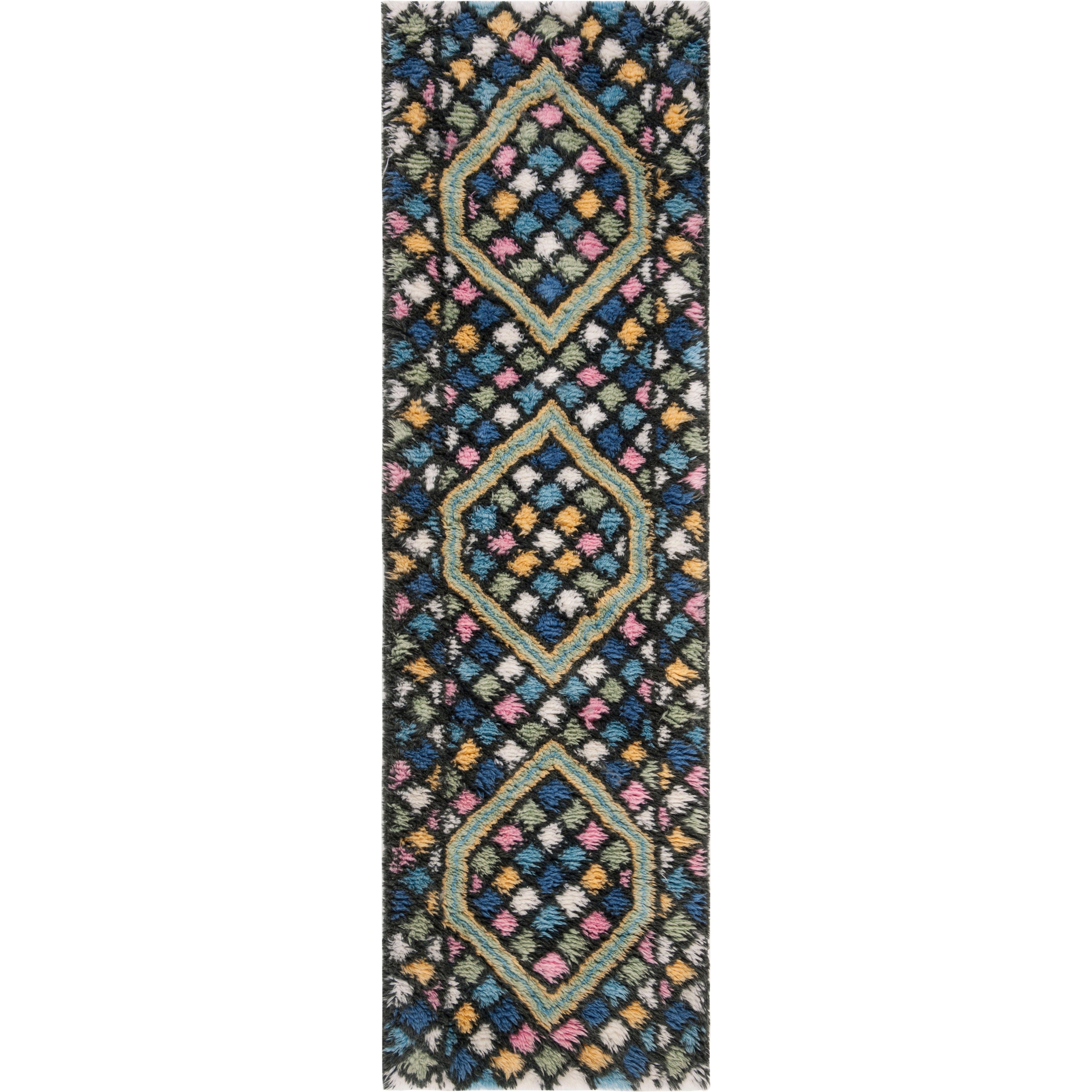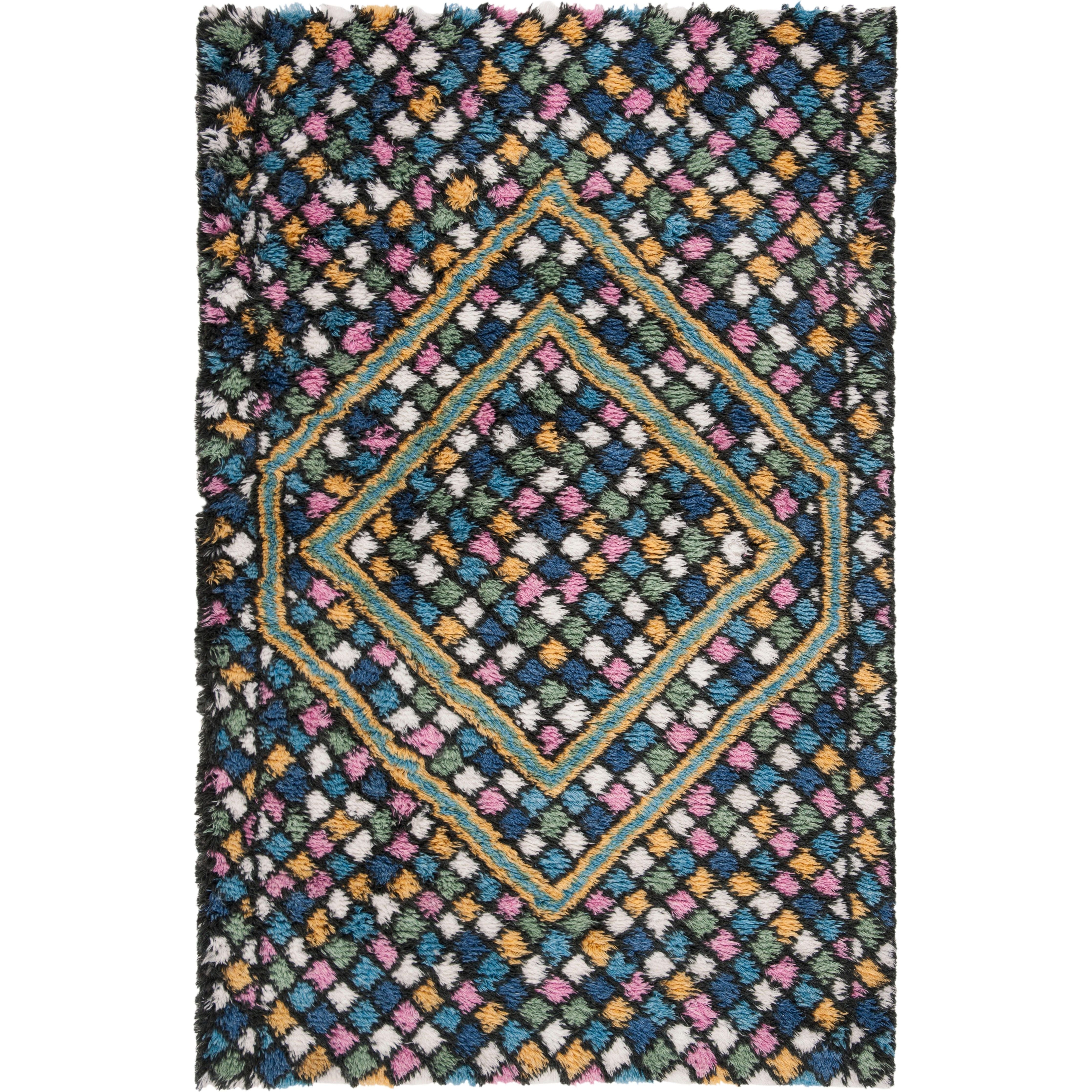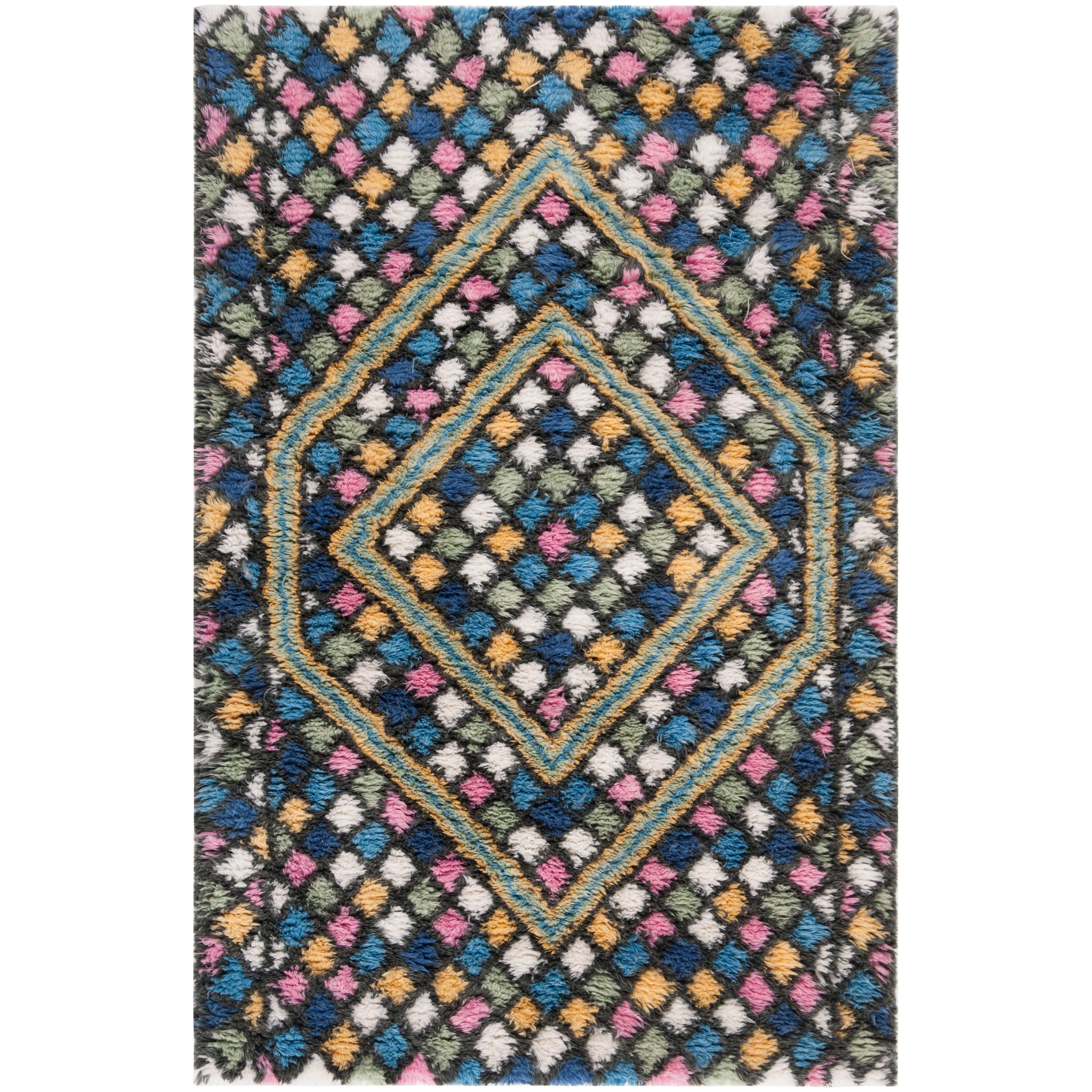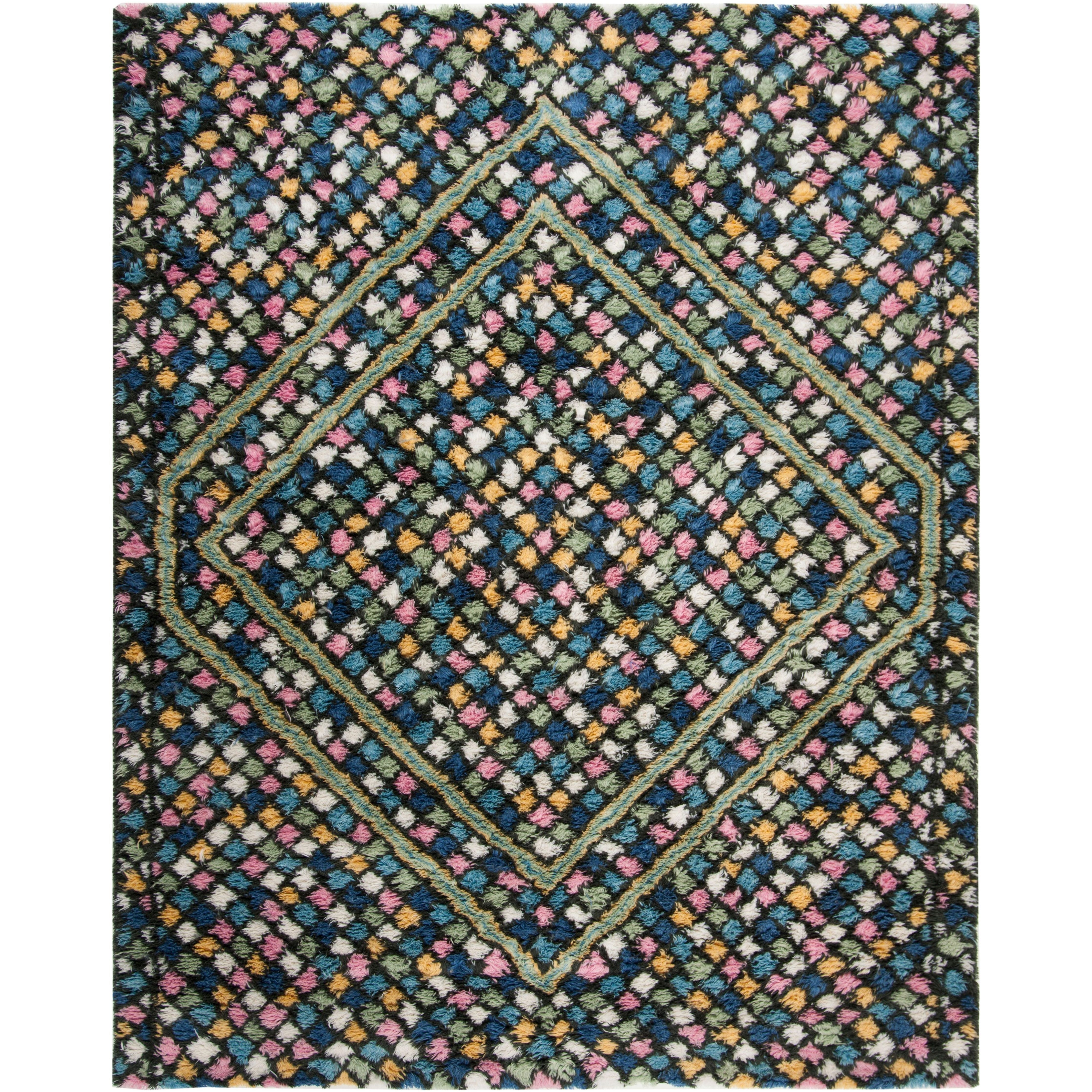Casablanca CSB750M Blue Gold rug from Safavieh's Casablanca Collection, a modern interpretation of the coveted Moroccan Beni Ourain rugs. This rug features a minimalistic design with a classic mosaic pattern of navy and ivory geometrics set into a soft washed blue shag pile. Perfect for adding a rustic touch to contemporary interiors, this rug is hand-tufted using premium New Zealand wool, offering the luxurious look and feel of a traditional Middle Eastern Flokati-style floor covering.
