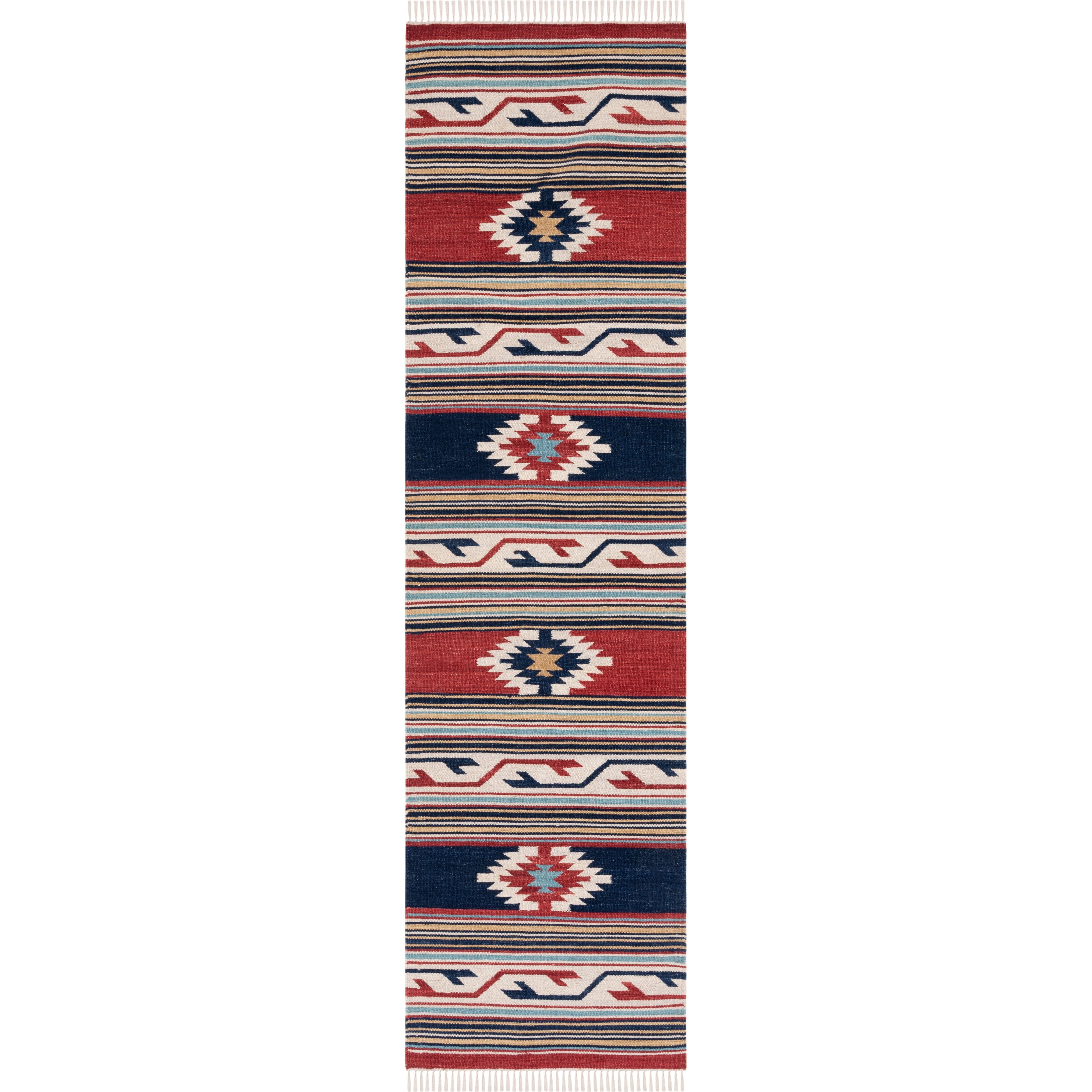 Kilim KLM711A by SAFAVIEH, a captivating addition to your home decor. Handmade with care, these bohemian flat weave area rugs showcase the rich traditions of nomadic artisans from the Middle East to Central Asia. The tribal-inspired designs and vibrant colors of the Kilim rug bring a touch of exotic charm to any room. With an approximate thickness of 0.25 inches, this rug is both stylish and durable.