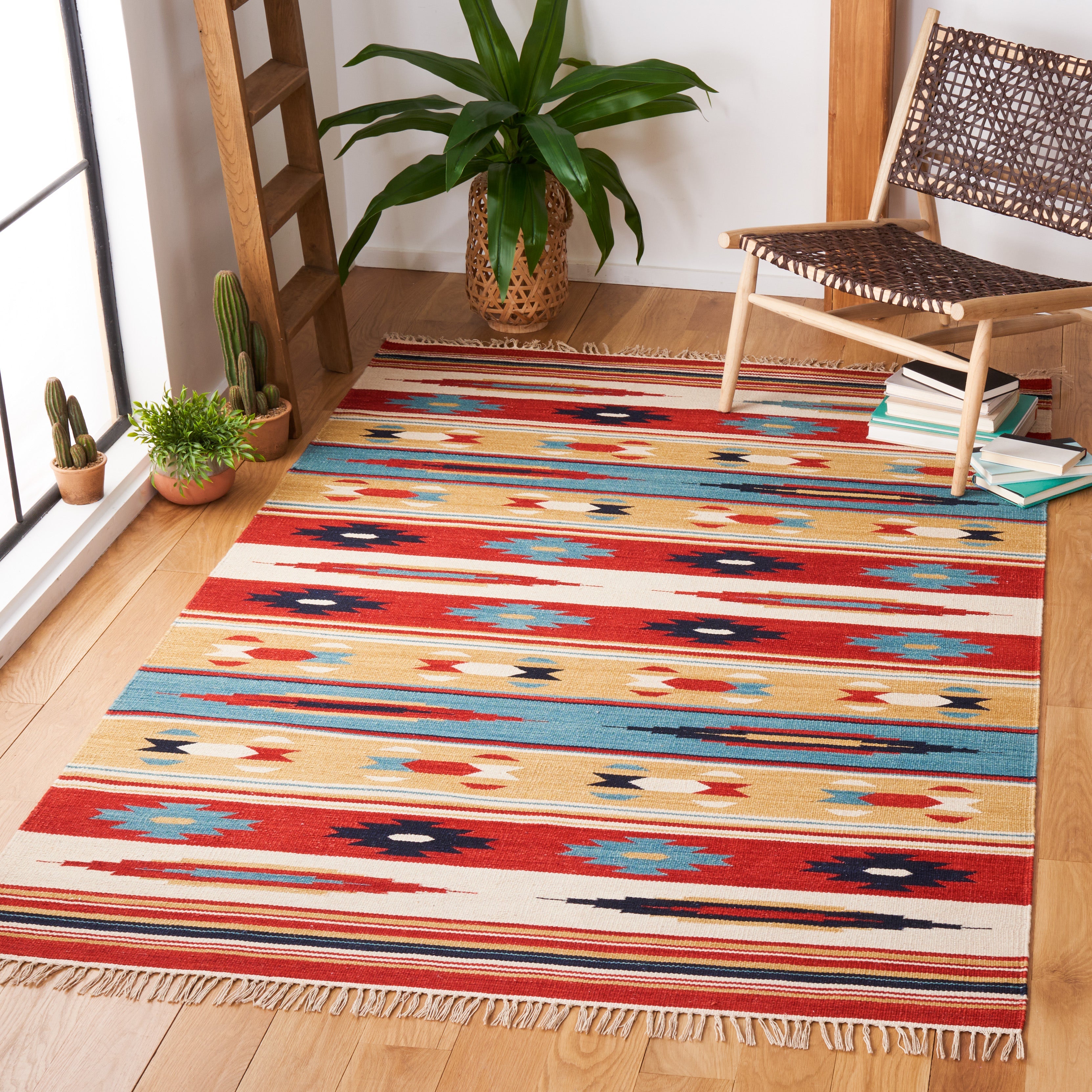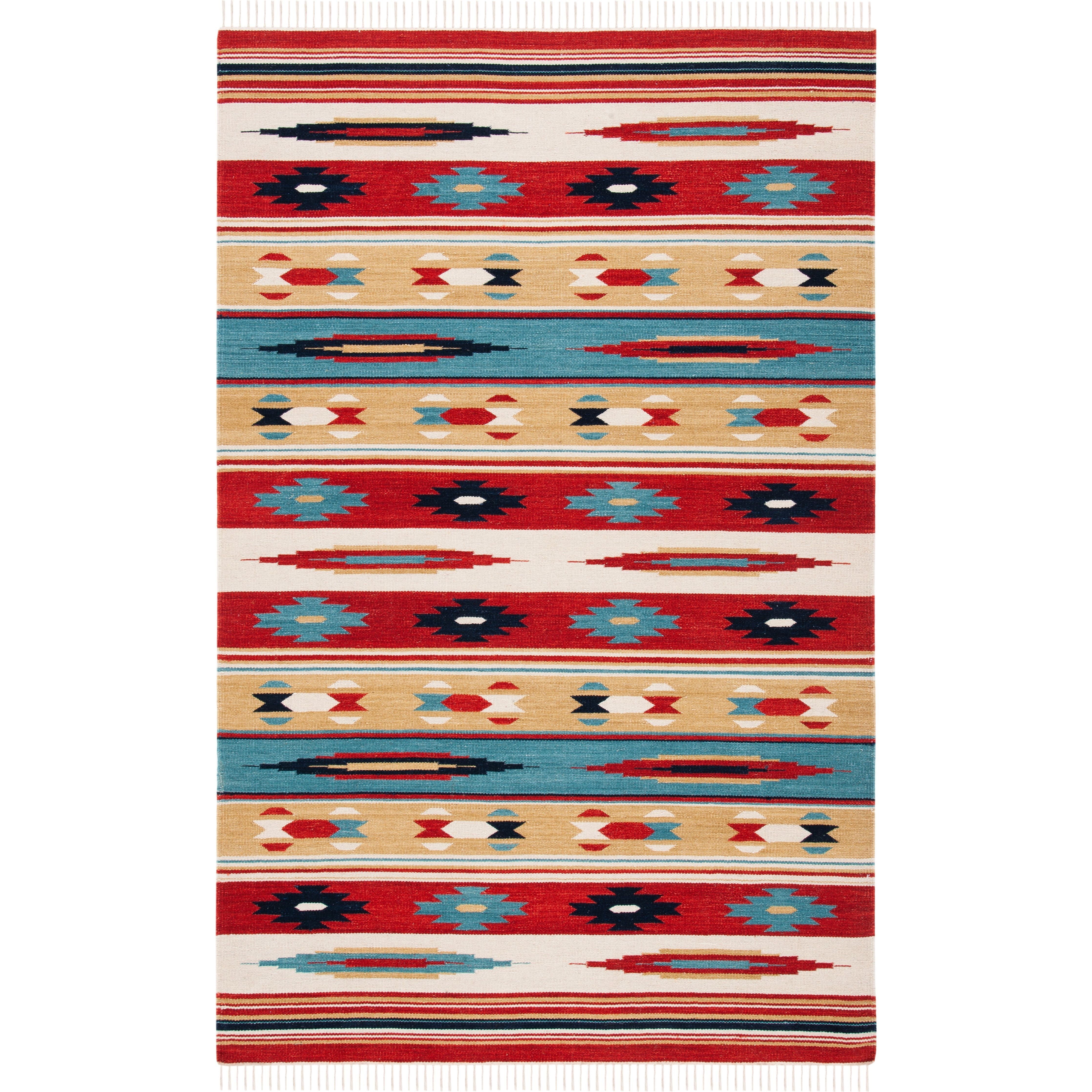Kilim KLM712A rug by SAFAVIEH, a stunning addition to your home decor. Handmade in the traditional styles of nomadic artisans across the Middle East and Central Asia, Kilim rugs are a beautiful representation of bohemian flat weave artistry. With vibrant tribal-inspired designs and rich colors, this rug brings an exotic touch to any room.