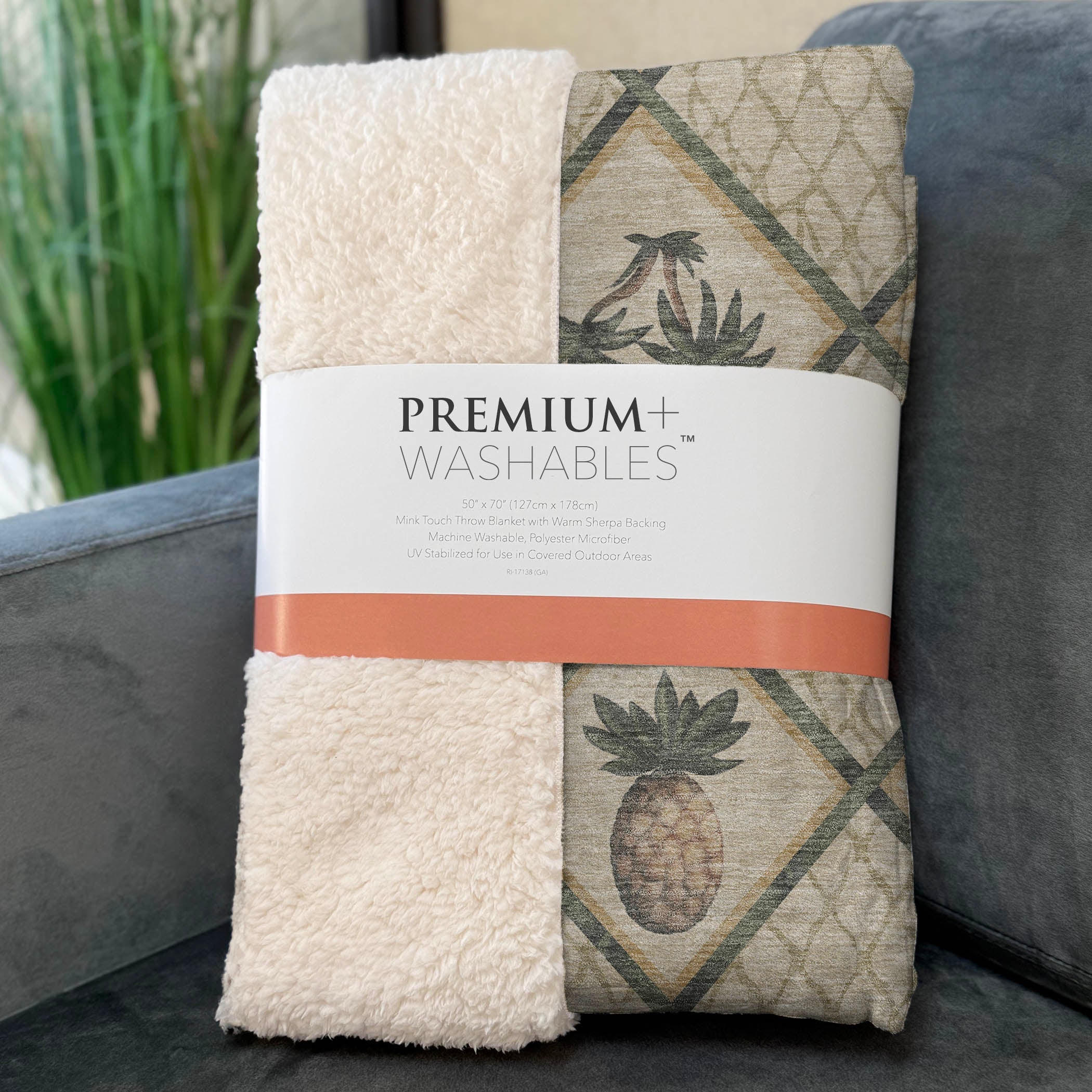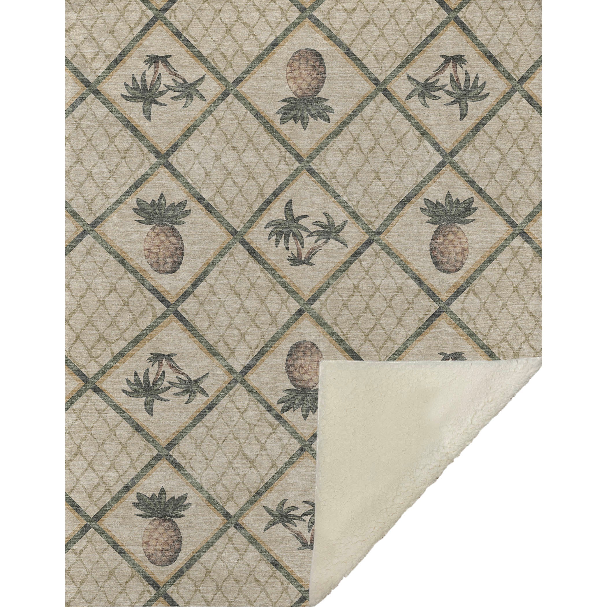 Bring the lush warmth of the tropics into your kitchen with a captivating blend of bamboo and pineapples nestled within a lattice field. Generously sized at 50" x 70", it envelops you in the sumptuous feel of a soft-touch front and the inviting warmth of sherpa backing. Crafted from fade-resistant polyester microfiber, it's perfect for both indoor and covered outdoor use, with the convenience of machine washability for easy care.