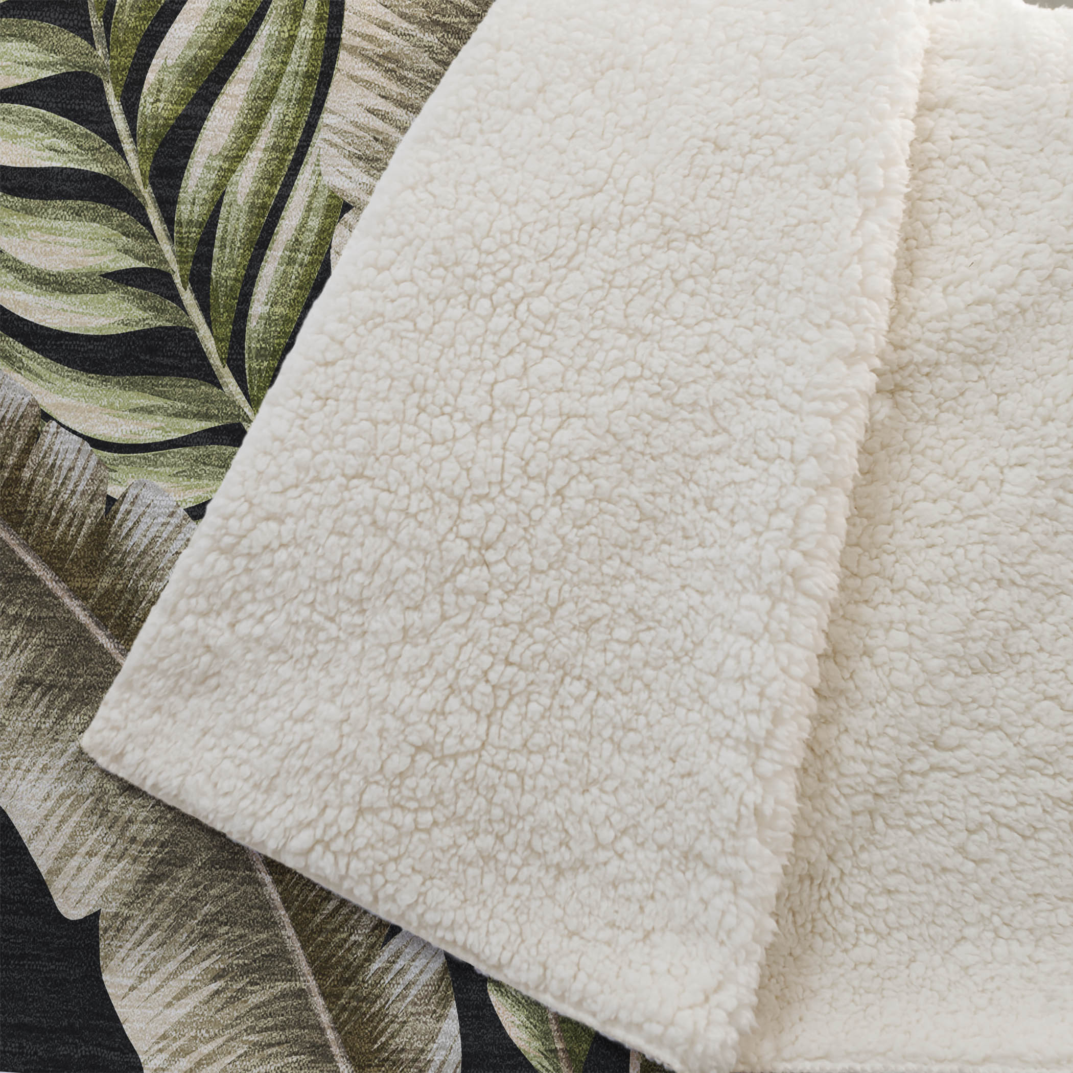 Immerse yourself in the lush allure of a tropical paradise with the vibrant play of large palm leaves, brought to life in an overscaled design that makes any room feel like a sunlit escape. Lovingly oversized at 50" x 70", it boasts an irresistibly soft-touch front and warm sherpa backing, enveloping you in blissful comfort. Expertly crafted from fade-resistant polyester microfiber, it’s perfectly suited for both indoor relaxation and covered outdoor bliss, with the ease of machine-washable care ensuring enduring beauty.