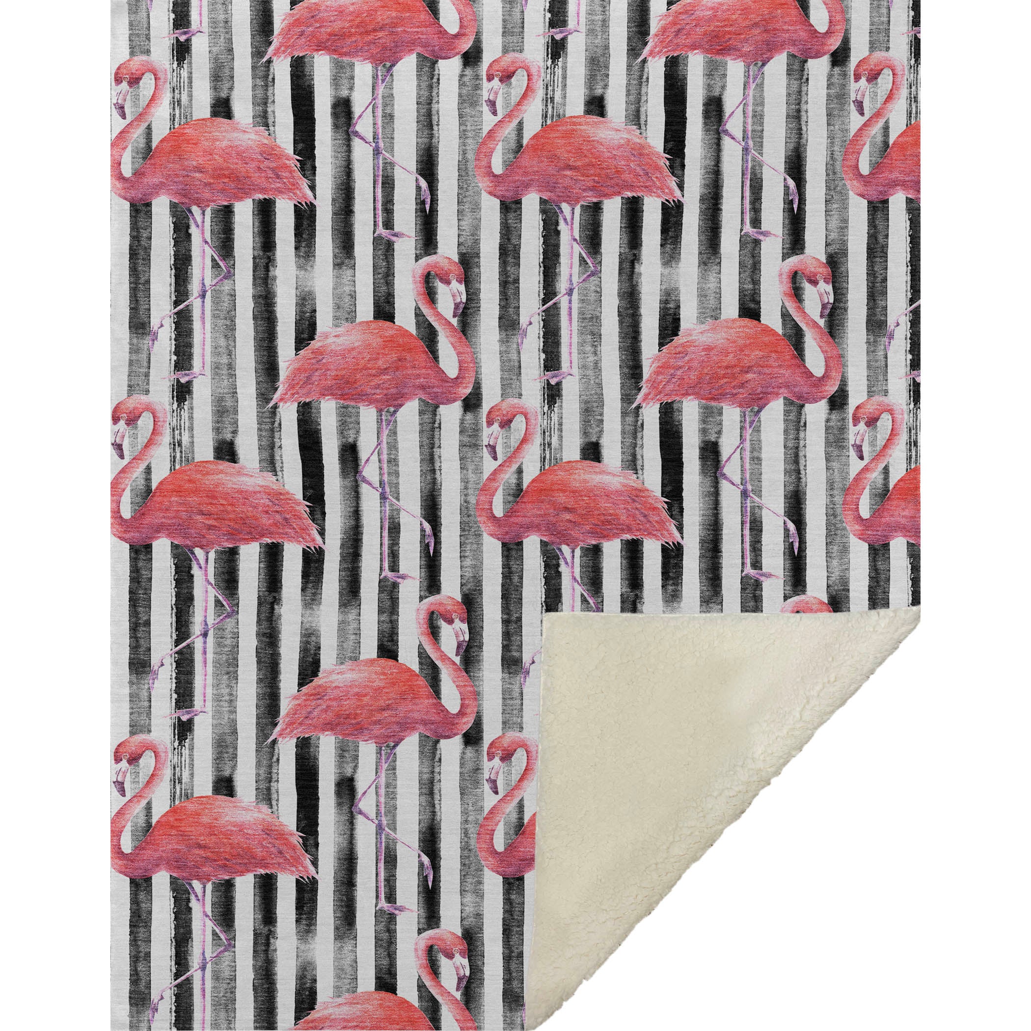 Striking black and white stripes interwoven with vibrant flamingos create a tropical paradise in any setting. These captivating designs breathe life into your decor, making any room feel like an exotic getaway. At an oversized 50" x 70", the soft-touch front and soothing sherpa backing offer unmatched comfort, while fade-resistant polyester microfiber guarantees lasting quality indoors and in covered outdoor spaces, all with the convenience of being machine washable.
