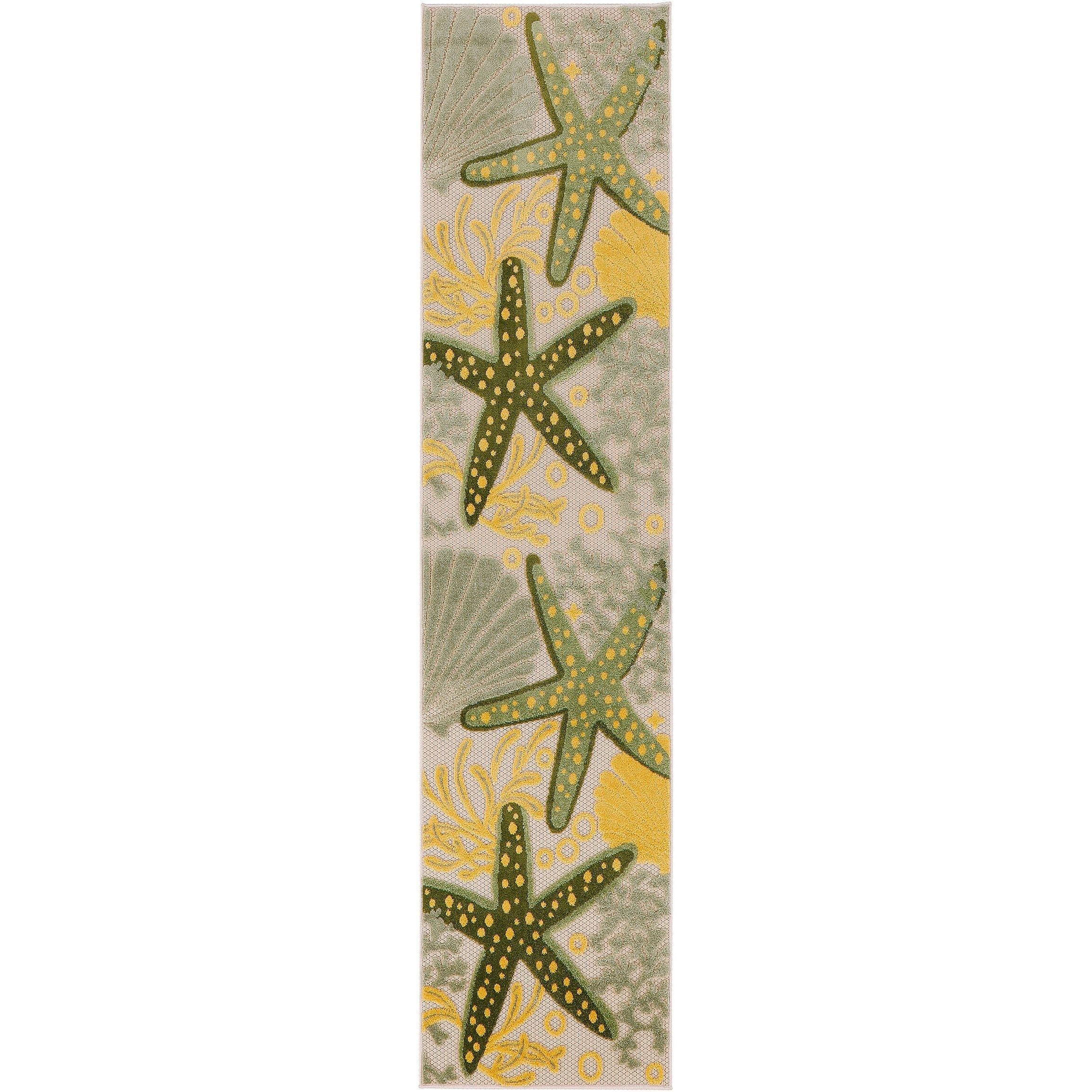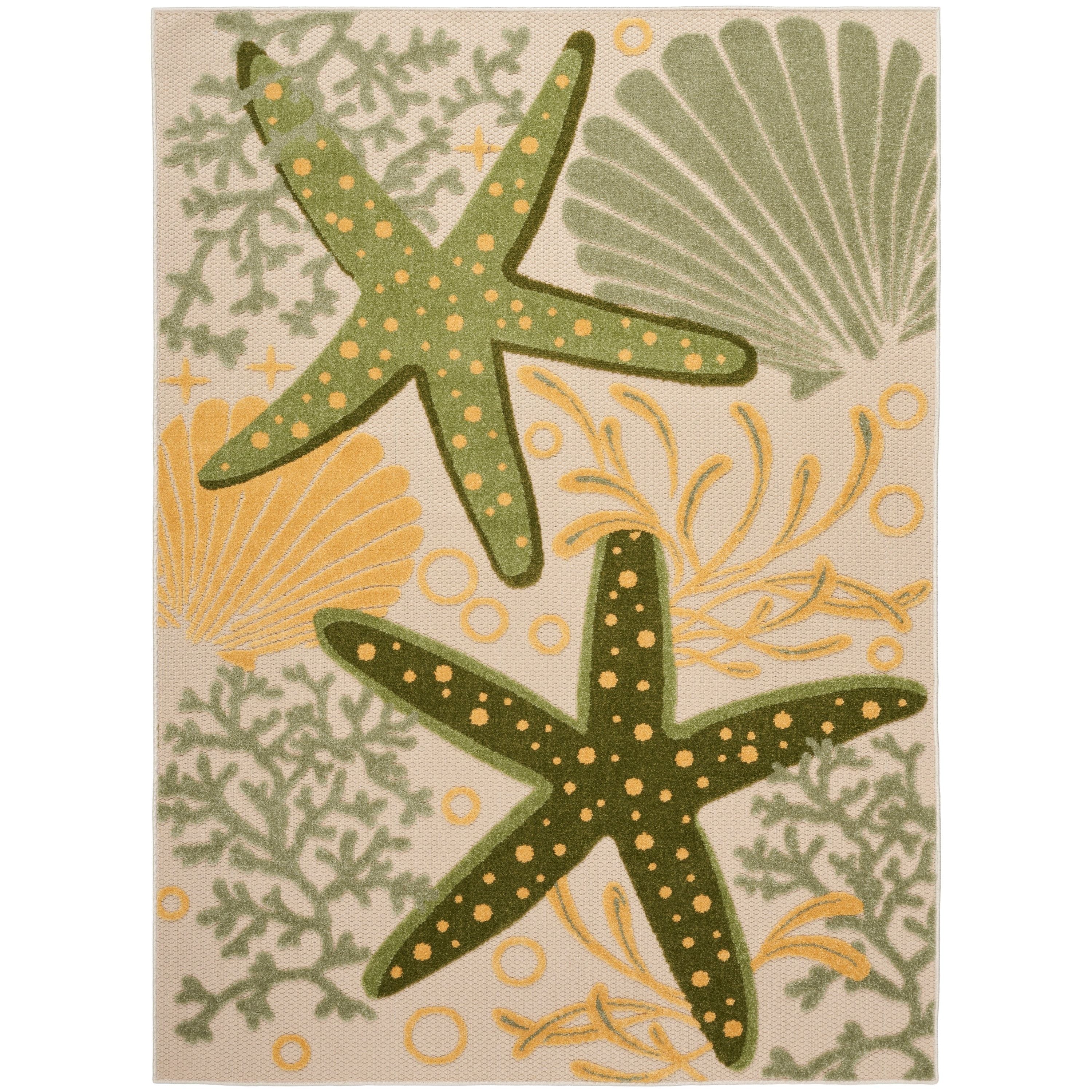 Elevate your outdoor space with the Aloha ALH24 Green Yellow area rug, designed to bring a touch of coastal charm to your decor. Featuring a delightful pattern of starfish, seashells, and undersea bubbles, this rug sets a playful backdrop for your patio or deck. Crafted from high-quality, stain-resistant materials, this rug is not only durable but also easy to clean – simply rinse with a hose and let it air dry. Add a pop of color and personality to any area inside or outside your home with this machine-made masterpiece from the Aloha Collection. Embrace the beach life right at your doorstep!