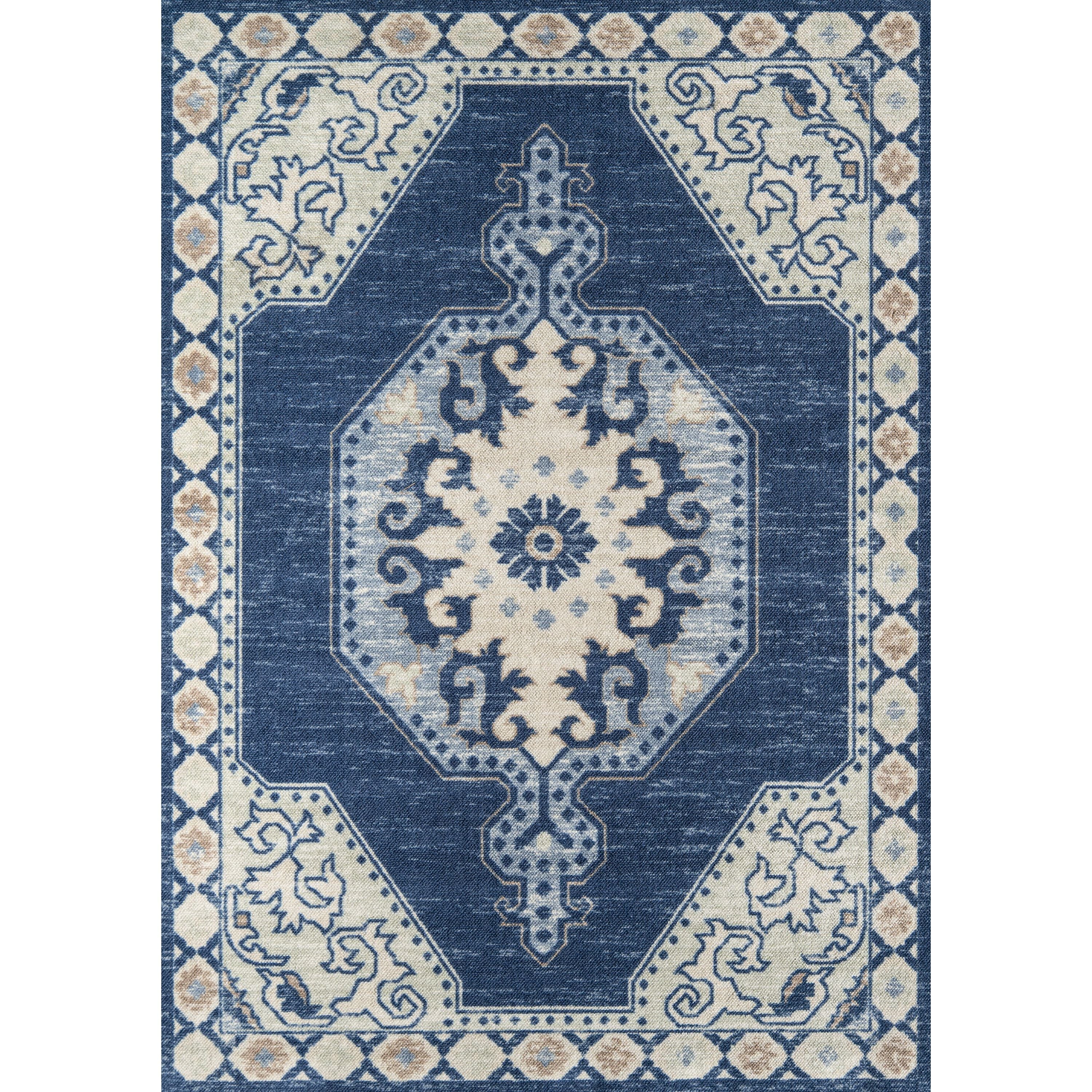 Anatolia Ana 3 Navy, a stunning addition to the Anatolia Collection. This rug showcases a pastel color palette that offers a softer take on tribal style. With gentle hues of pink, baby blue, and brown adorning the field and ornamental borders, this rug features classical medallions and vine and dot motifs for a timeless appeal.