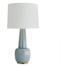 The traditional shape of this porcelain lamp features an elongated ribbed neck that towers the top of a rounded base. A celadon finish pulls where the neck and base connect delivering an eye-catching element that accentuates its feminine frame. Showcased on a gold-finished platform for a more polished appeal—a quintessential luminescent for traditional spaces. Topped with an off-white linen drum shade with off-white cotton lining and a matching porcelain finial. Finish may vary.