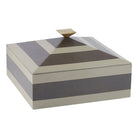 Tonal stripes add a tailored finish to a two-toned dove and graphite leather box. This pyramid-inspired accessory is topped with a bronze-plated handle that reflects its geometric lines. Lined in soft suede. Finish will vary.
