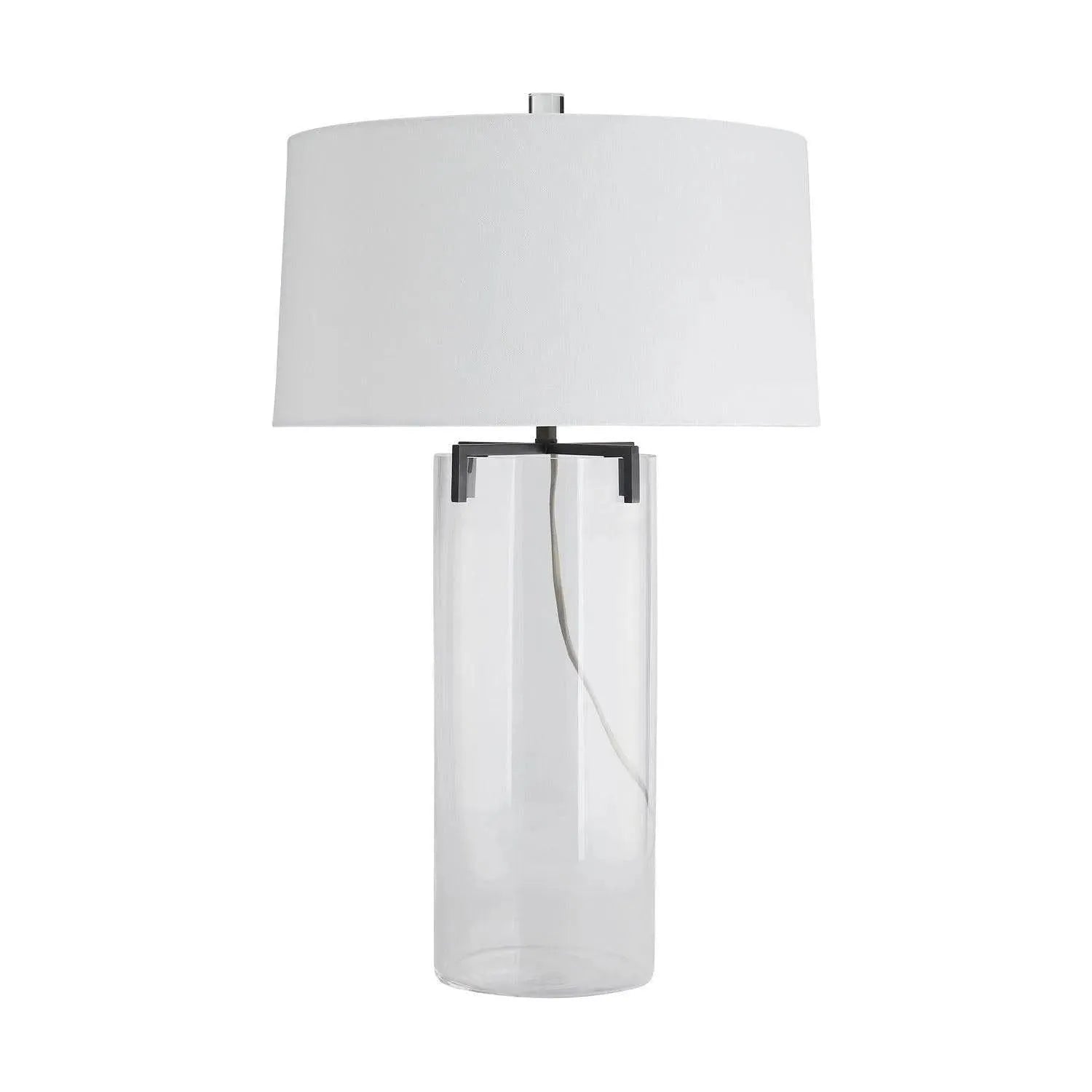Featuring a cylindrical glass body the Dale Lamp elevates simplicity. Lacking a base and a formal cap the Dale uses negative space and transparency to in fact add more to its space. Replacing the traditional cap is a claw-like top that gives way to its neck and shade with white microfiber lining. Features a matching finial and a taupe cloth cord.