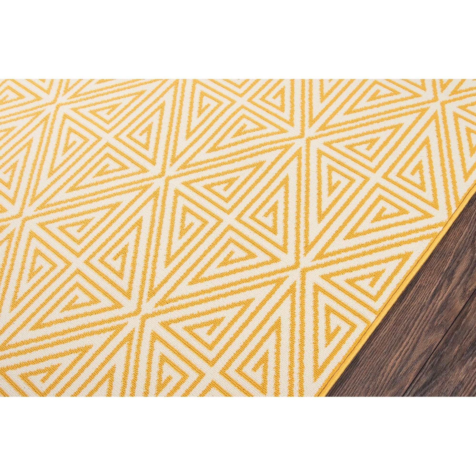 Baja Baj 4 Yellow area rug, a versatile and stylish addition to your indoor or outdoor living space. This all-weather rug features a blend of stripes, diamonds, trellis, and nautical motifs like ropes and anchors, creating a sophisticated look that complements any decor. Perfect for patios, porches, or pool decks, this rug is designed to withstand the elements with its durable power-loomed construction.