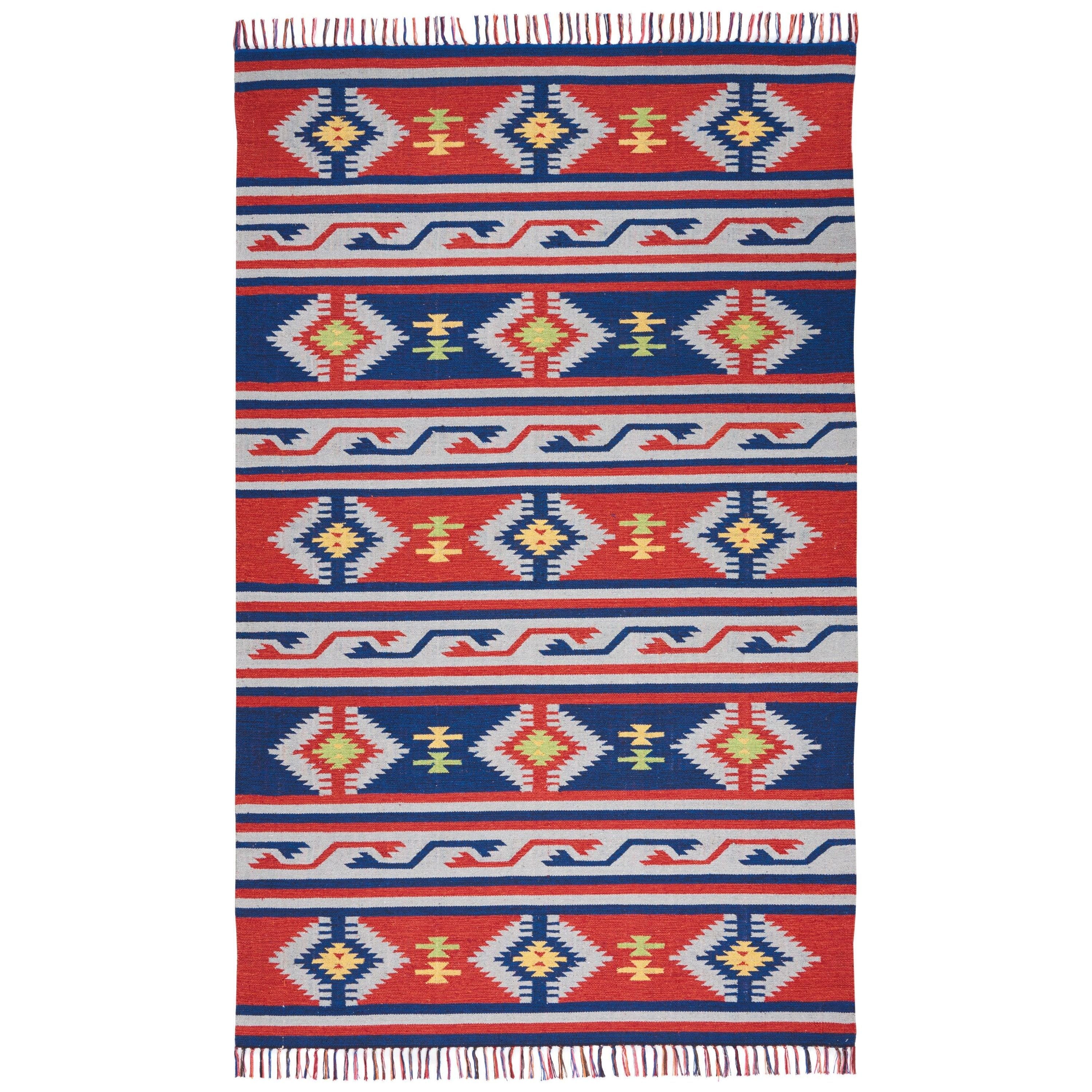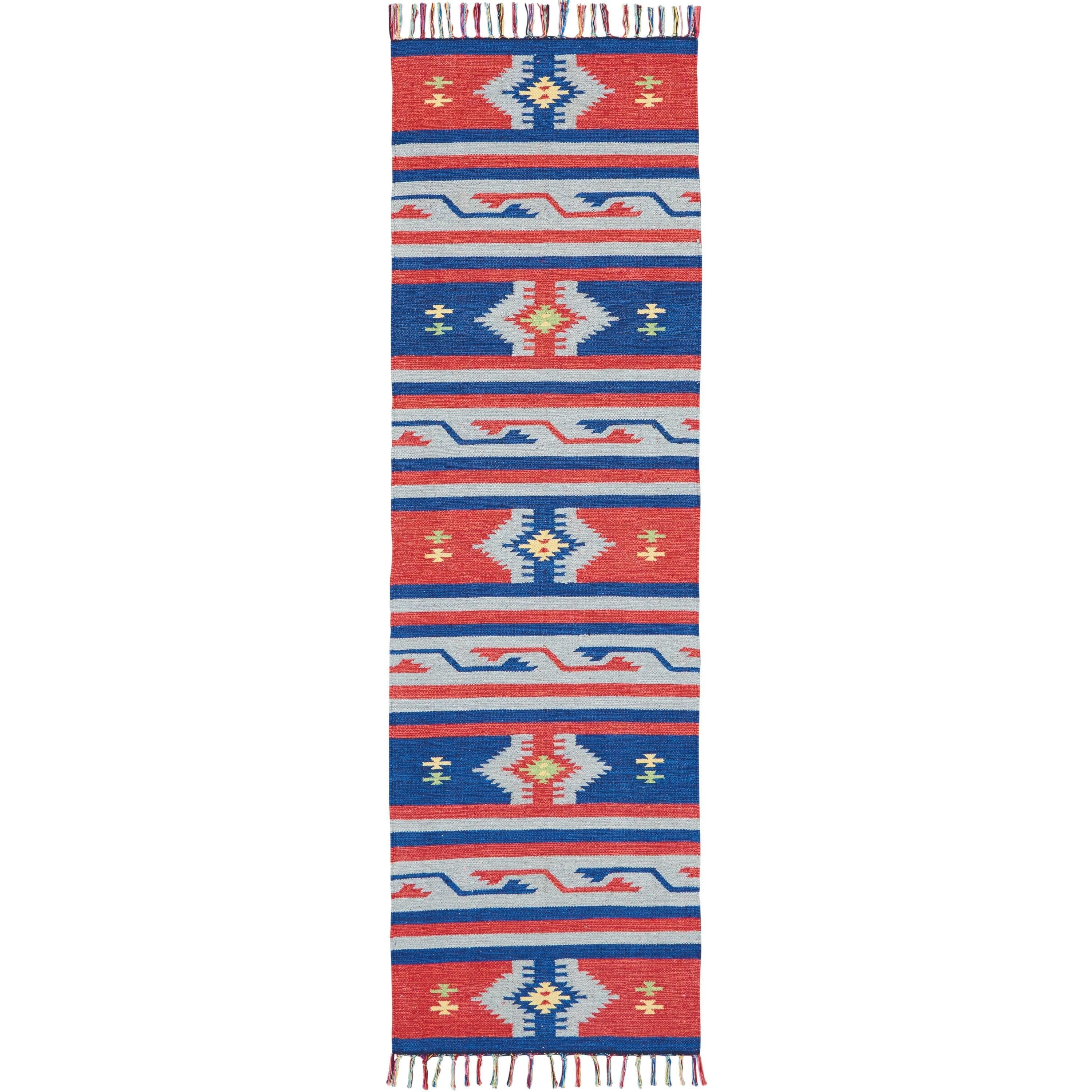 Baja BAJ03 Blue Red area rug from our unique Baja Collection. Inspired by tribal influences and vibrant colors, this flat weave rug offers casual comfort and a touch of modern style to any room. Perfect for contemporary, traditional, or eclectic spaces, these rugs feature tribal designs reminiscent of Moroccan, Ikat, and Kilim patterns in home decor.