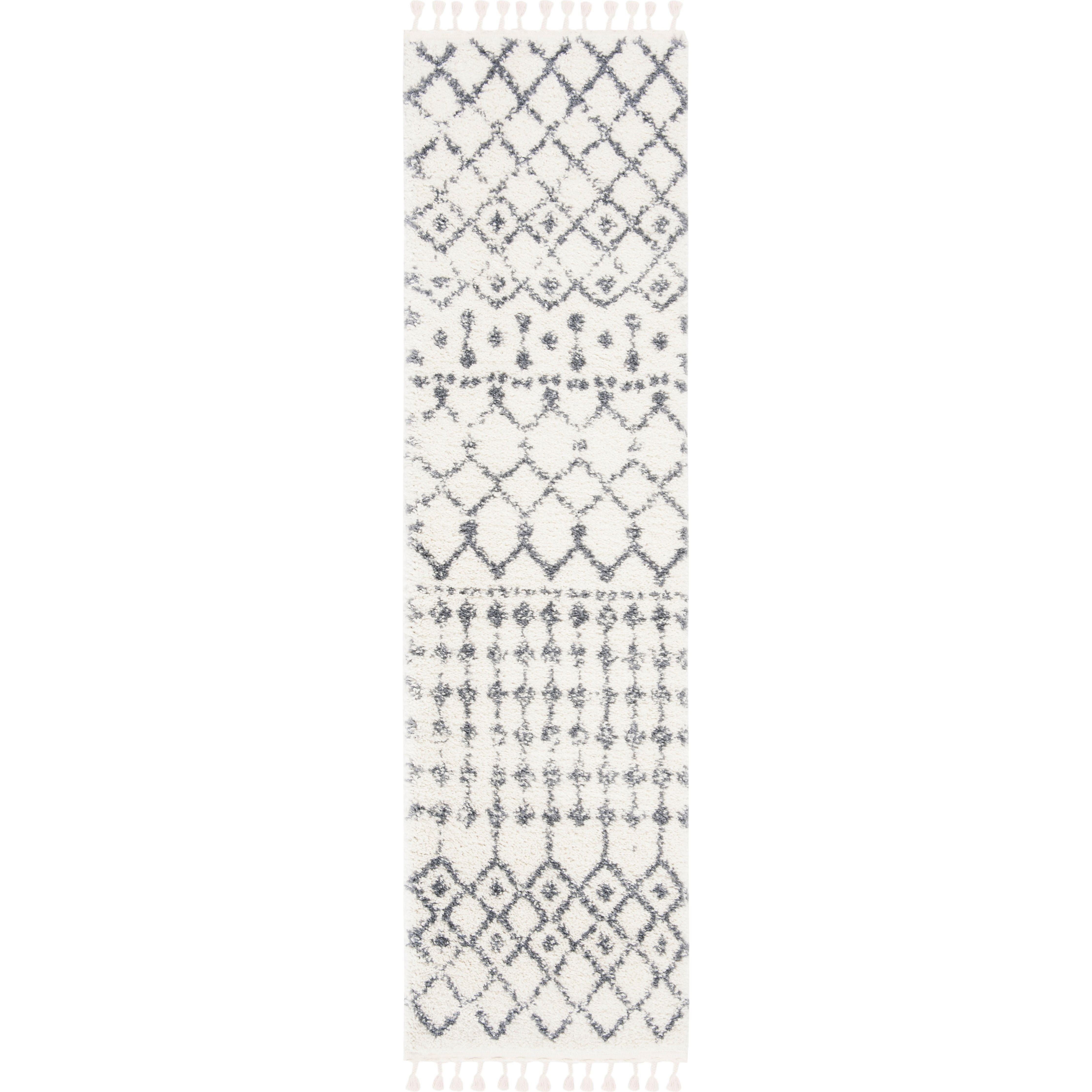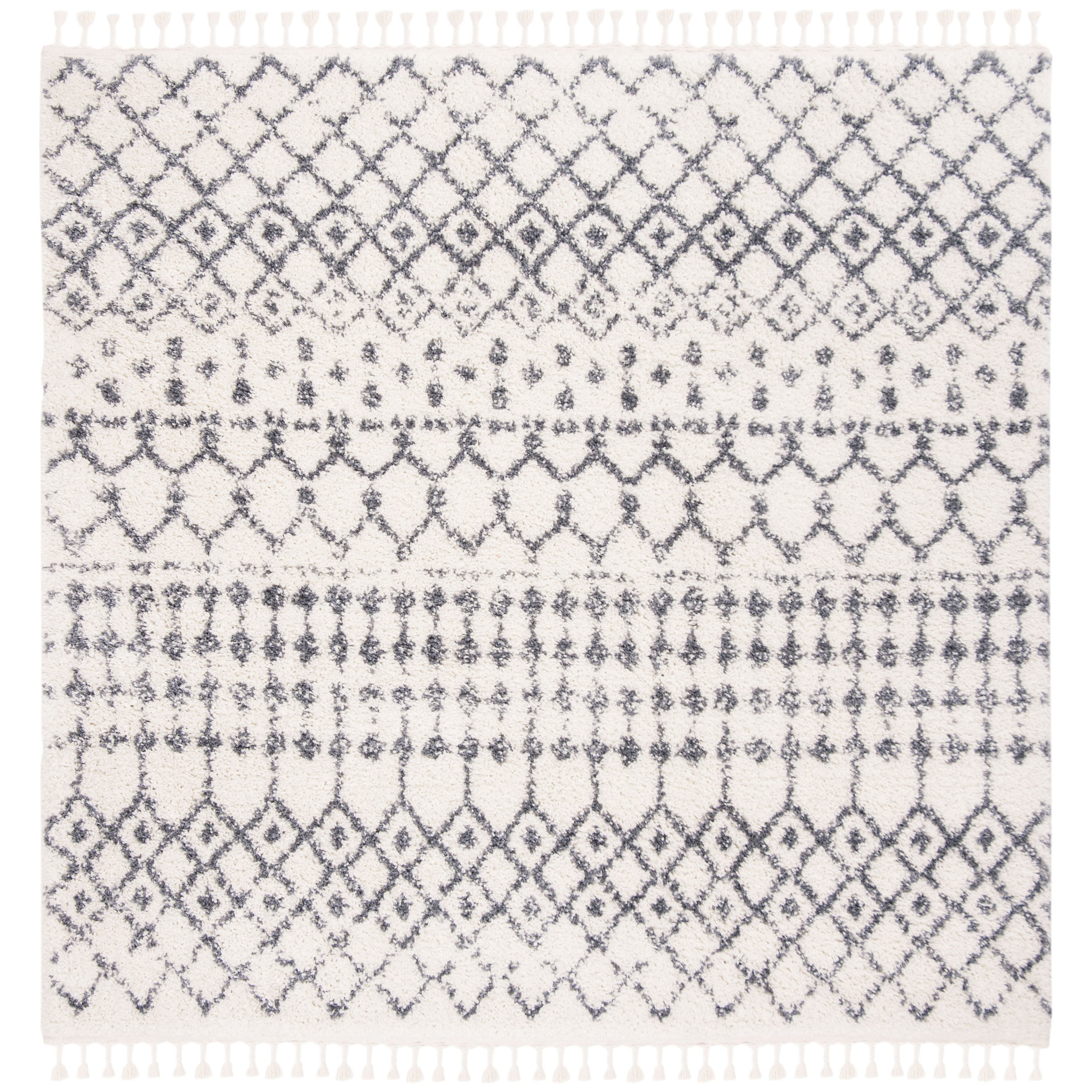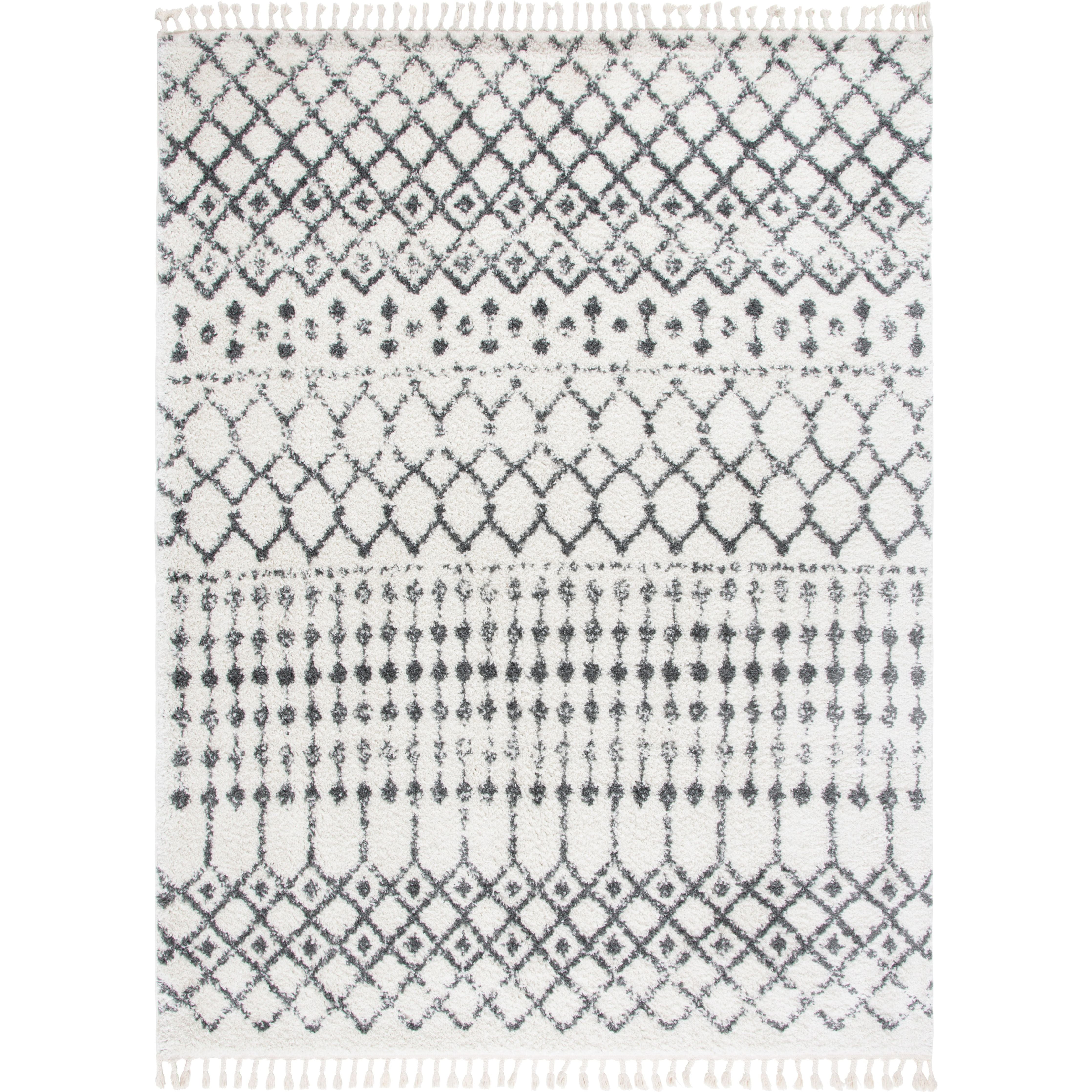 Berber Fringe Shag BFG540A Cream Dark Grey rug, a fusion of Moroccan traditional and modern designs reimagined for contemporary spaces. Crafted with easy-care fibers, this rug features low-shedding properties and intricate fringe detailing inspired by classic trellis patterns. The rug boasts a luxurious thickness of approximately 1.2 inches, adding depth and texture to any room.