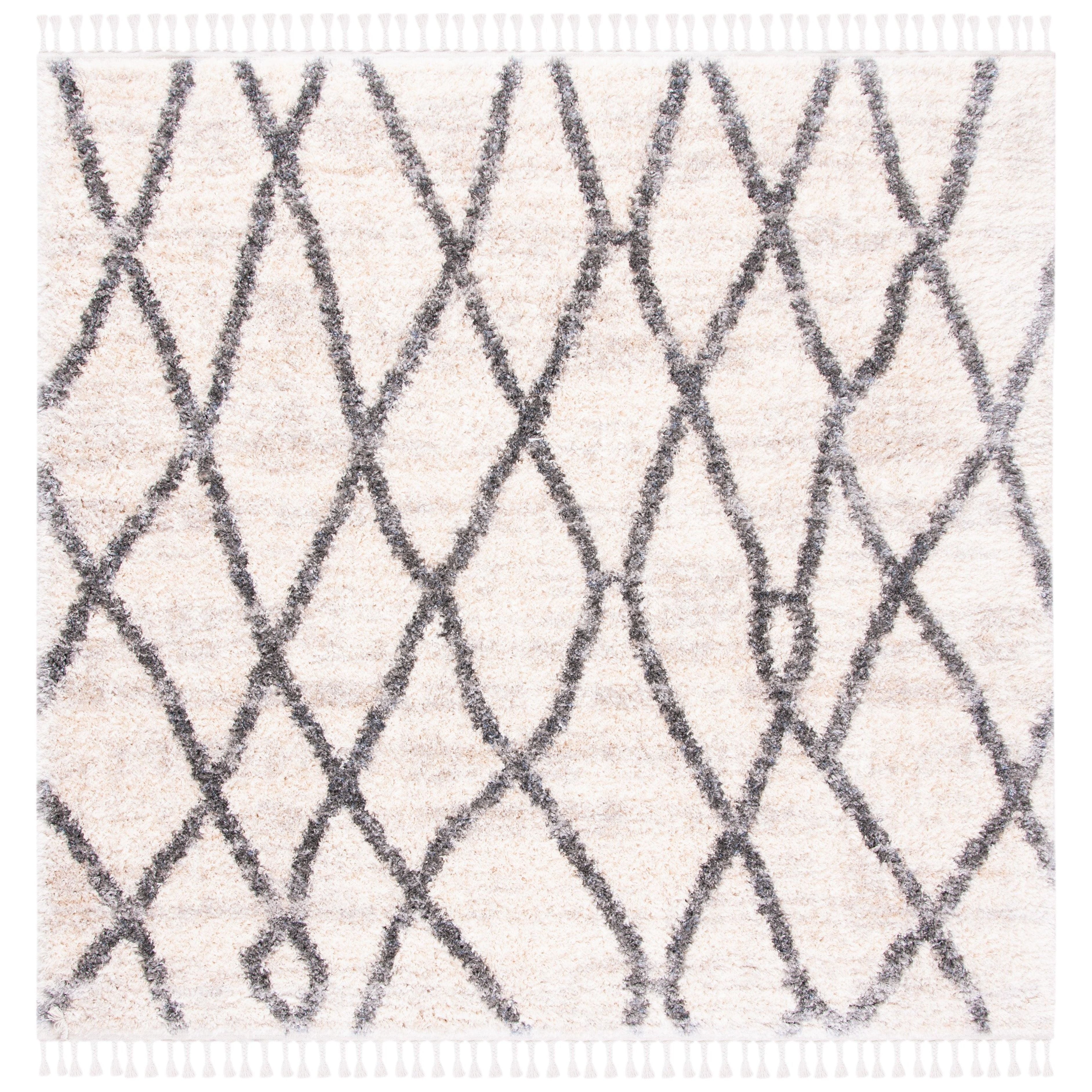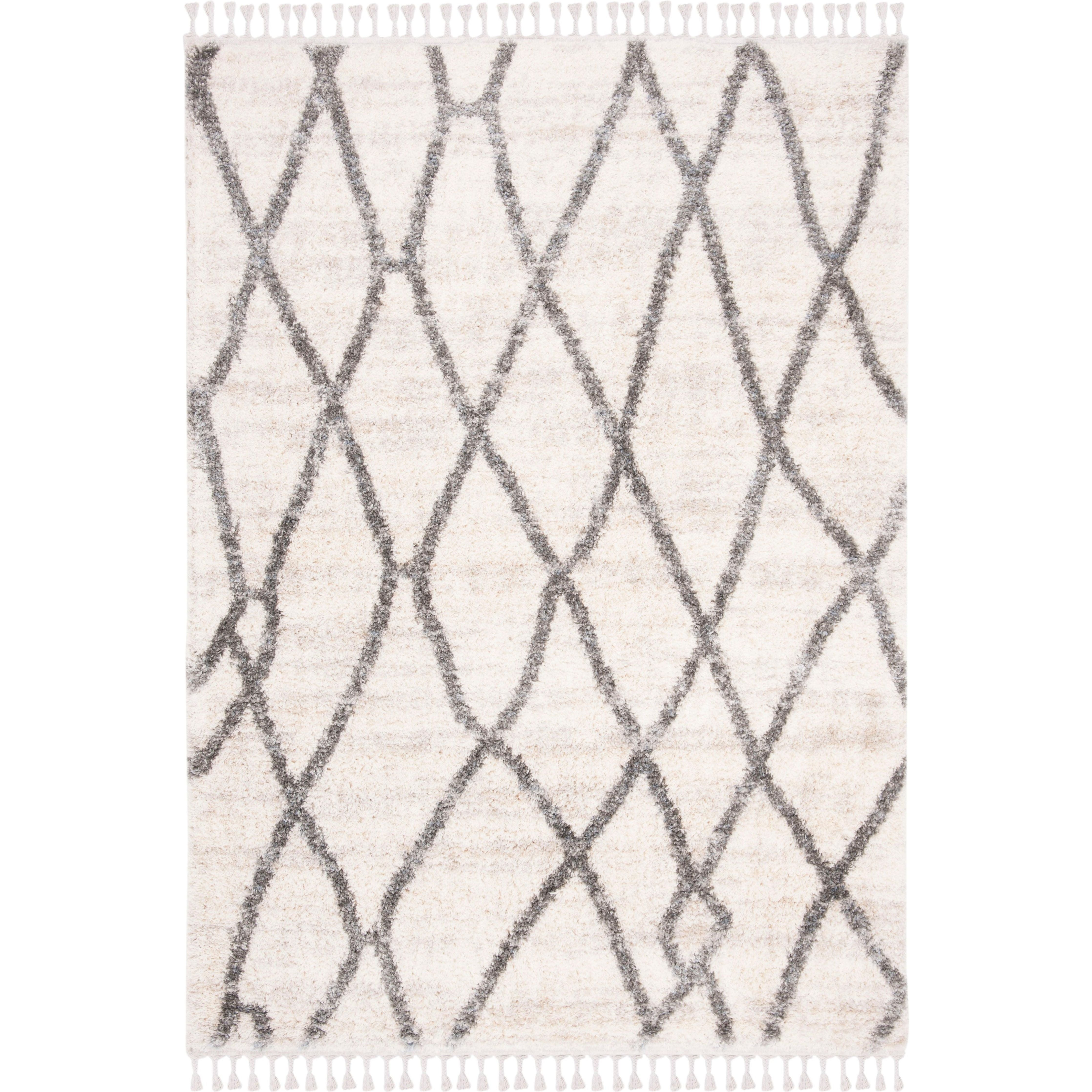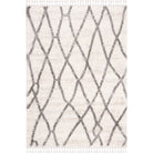 Berber Fringe Shag BFG628B in Creme Black, a stunning rug inspired by the intricate designs of Morocco. This modern twist on traditional aesthetics features distinctive fringe detailing and a classic trellis pattern, all crafted with easy-care fibers to minimize shedding. With an approximate thickness of 1.2 inches, this rug adds both style and comfort to any space.