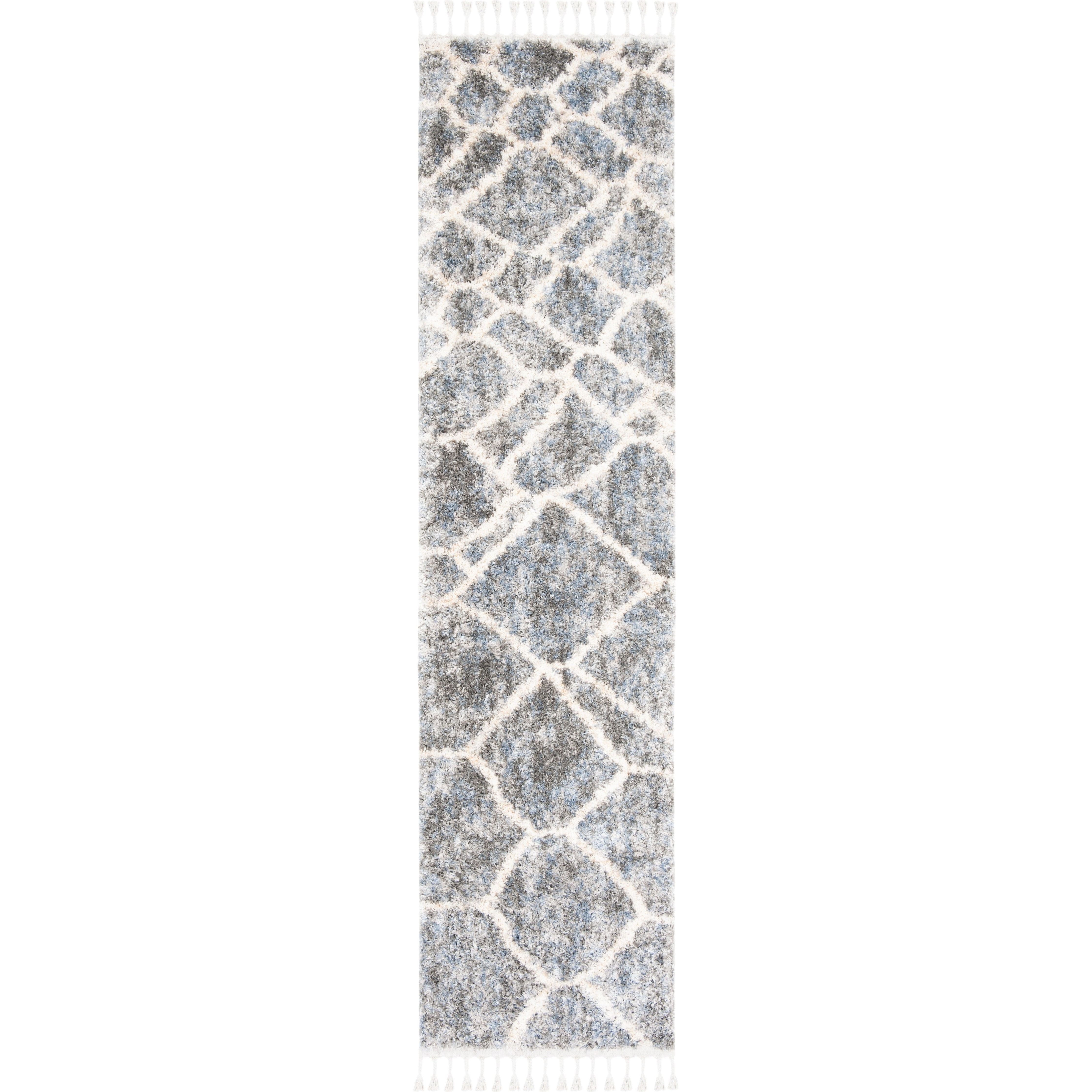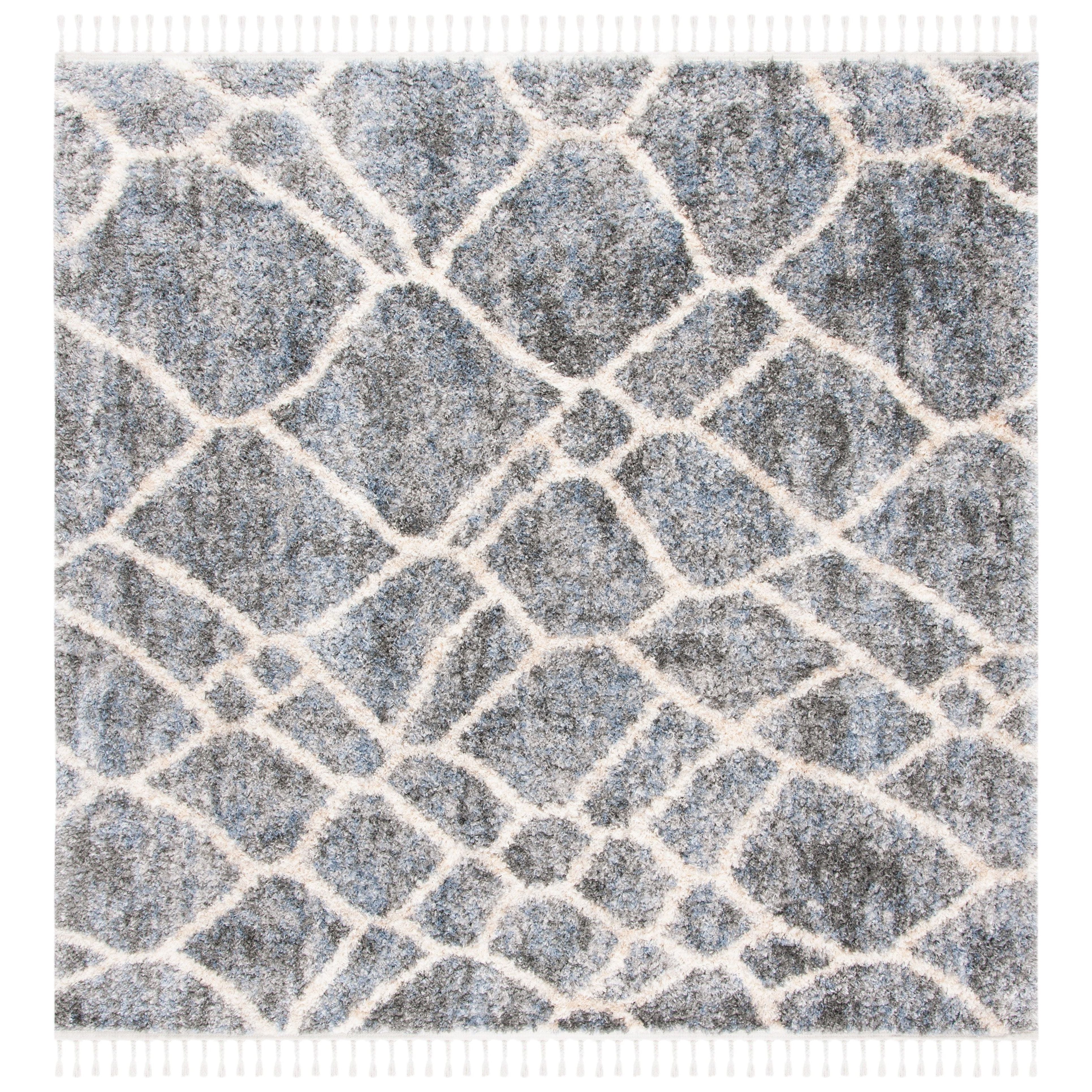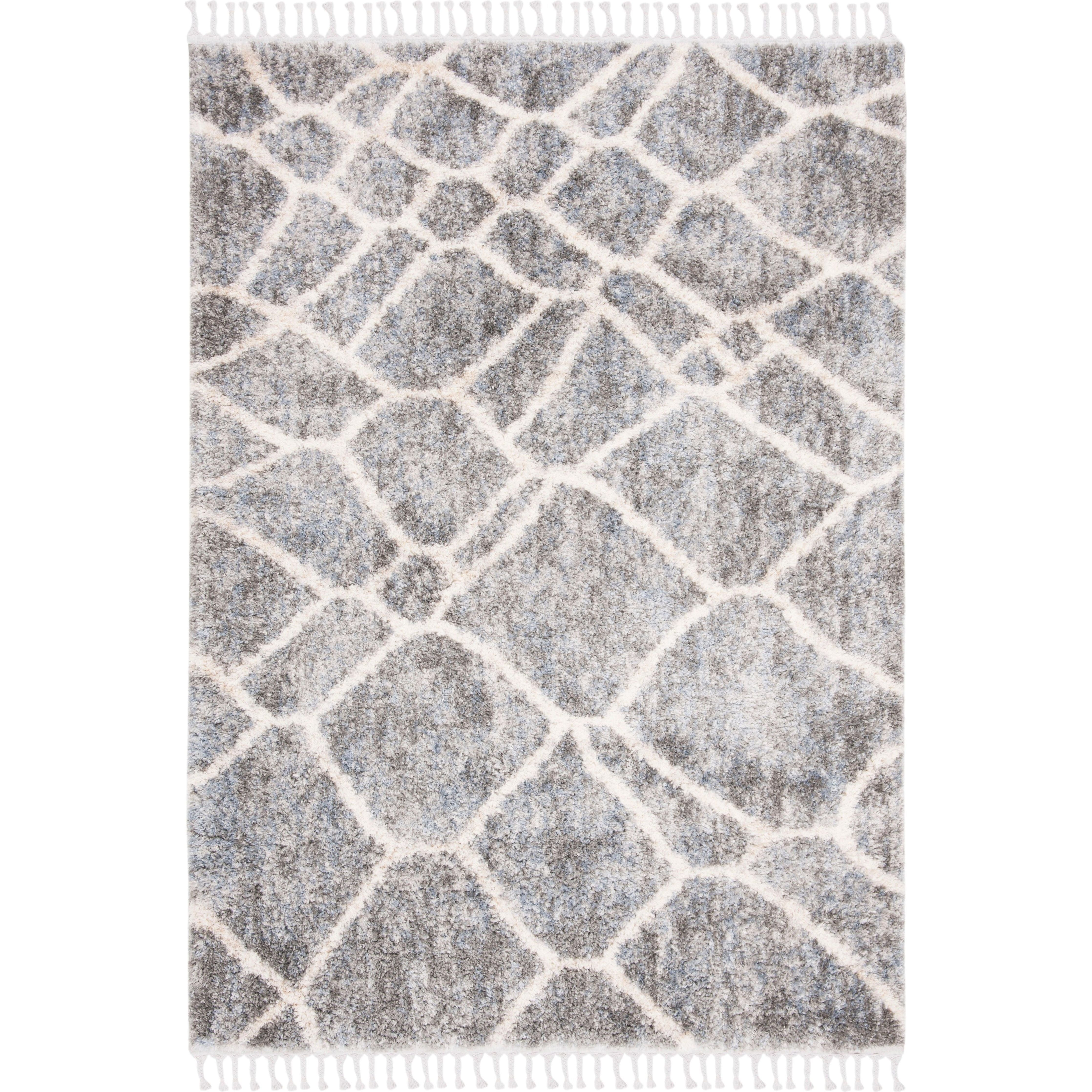 Berber Fringe Shag BFG629F in Grey Cream, drawing inspiration from the rich traditional and contemporary designs of Morocco. These rugs beautifully blend old-world charm with modern sensibilities, featuring easy-care fibers that minimize shedding, eye-catching fringe accents, and unique variations on the classic trellis motif. With a plush thickness of approximately 1.2 inches, this rug adds both comfort and style to any space.