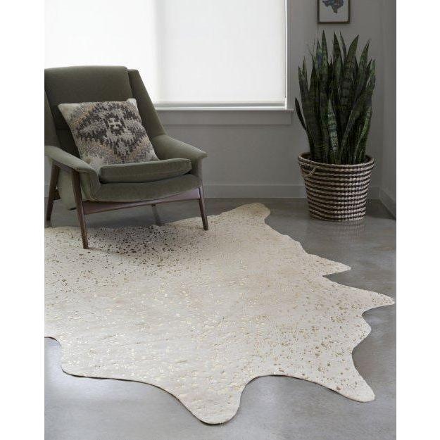 Bryce Bz 08 Ivory Champagne rug, a stylish twist on the classic cowhide design. The Bryce Collection features luxurious metallic details complemented by neutral shades, adding a touch of sophistication to any room. Crafted in China using high-quality 100% acrylic material, this rug is built to withstand heavy foot traffic in your living room, dining space, or entryway.
