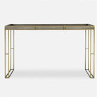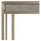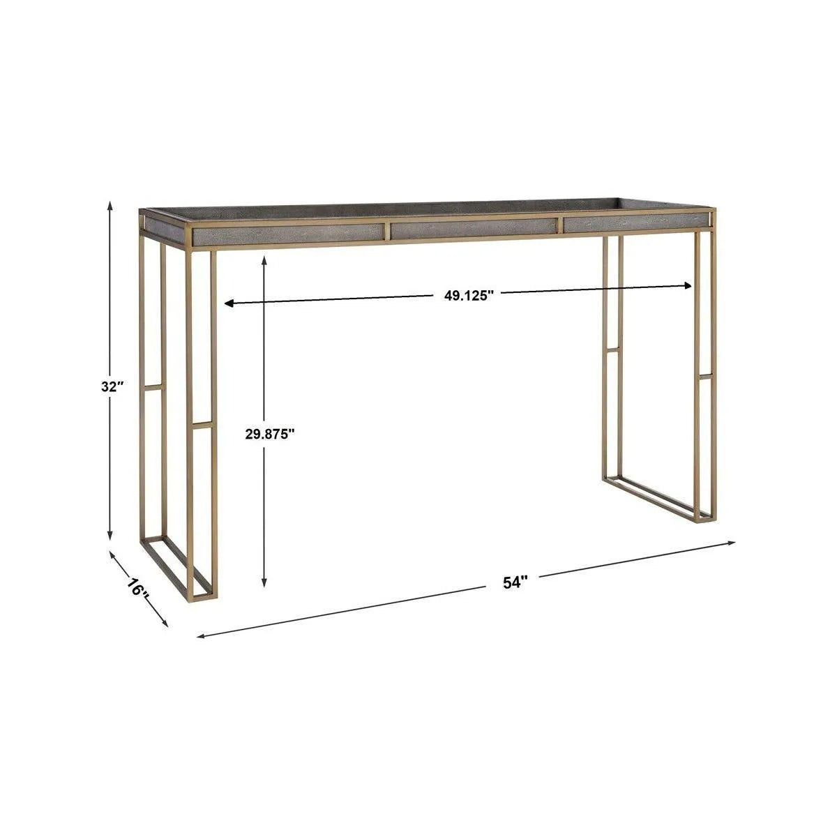 Exhibiting a modern minimalist design, this tray style console table features a rich, charcoal gray faux shagreen paired with a plated brushed brass steel frame.