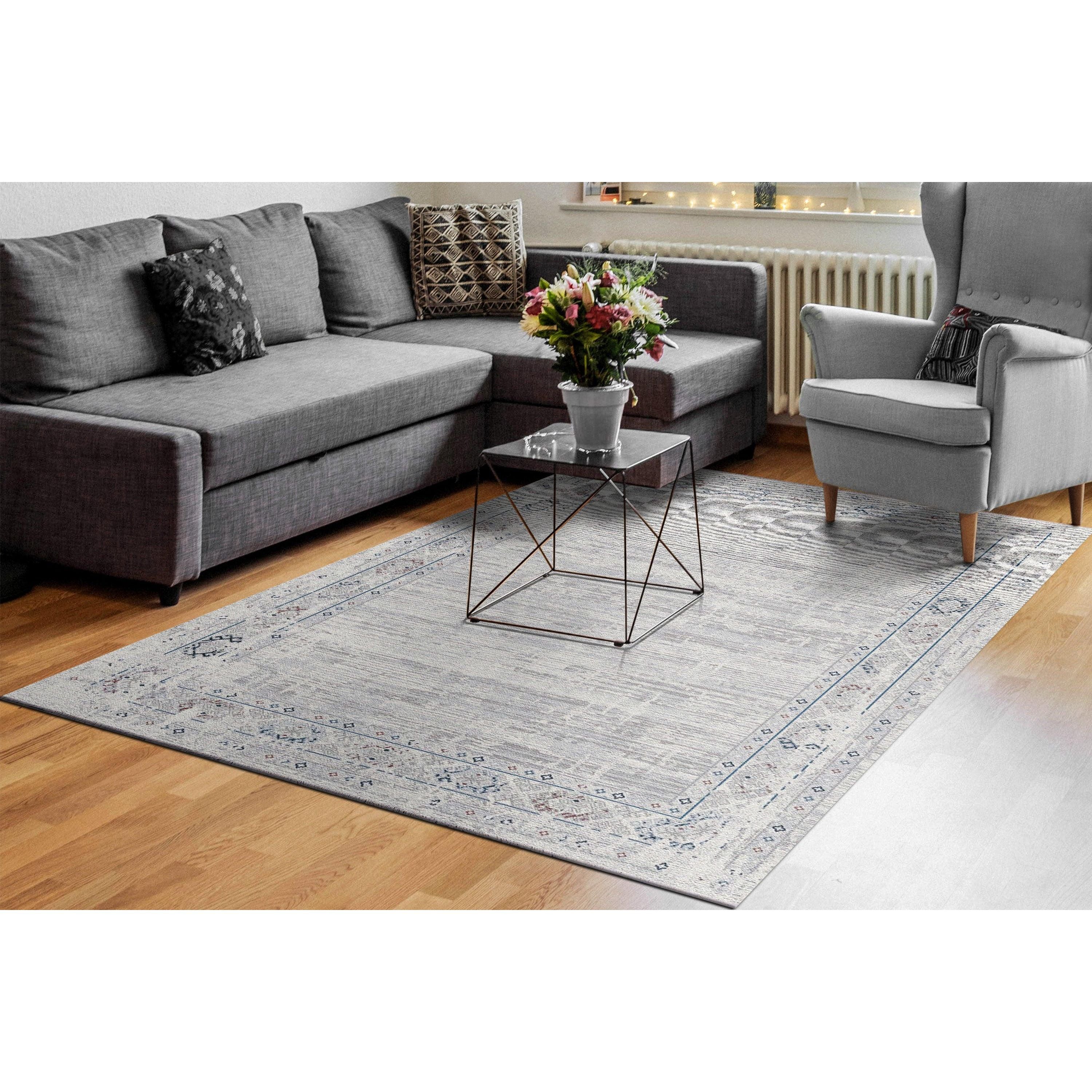Carson 5222 Grey Ivory rug, a part of the sophisticated Carson collection. This modern design is sure to make a statement in any room it graces. The blend of neutral ivory tones with intricate blue and copper detailing creates a visually captivating piece that can seamlessly fit into various decor styles.
