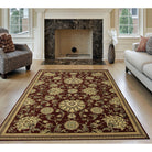 Castello 450 Burg area rug, featuring a timeless floral scroll design that seamlessly blends into any decor style. This transitional pattern showcases large floral motifs on a rich burgundy base, accented by a delicate floral pattern for added elegance. Crafted in Turkey using high-quality heat-set polypropylene, this machine-made rug offers a soft texture, durability, and easy maintenance for busy households.