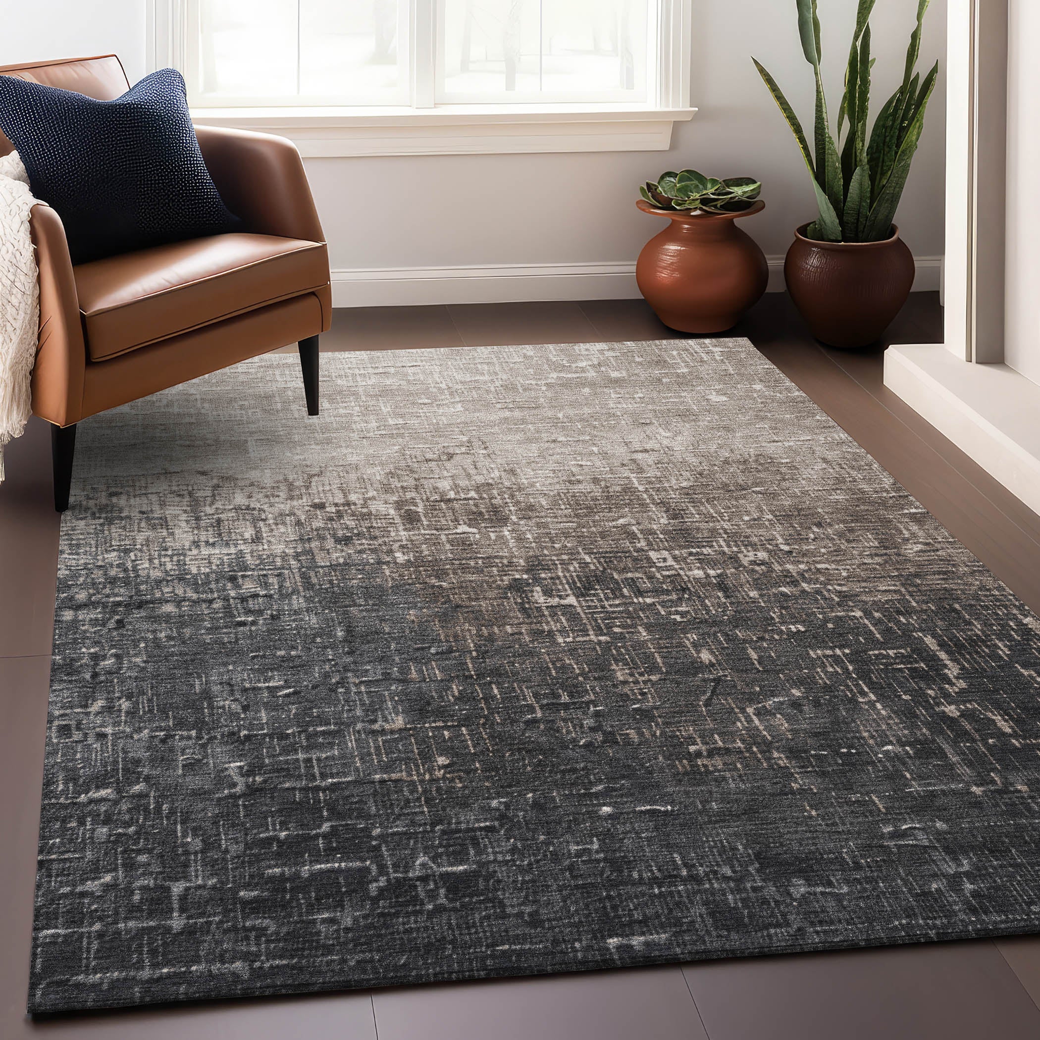 Our area rug is crafted with a stunning ombre effect, enriched with delicate random lines that create a dynamic visual appeal. This transitional design seamlessly complements both contemporary and classic interiors. Its UV stabilized to prevent fading, ultra-thin for versatility across various spaces, and machine-washable for effortless upkeep, ensuring it remains family and pet friendly.