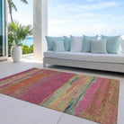 The modern pattern of a wide central band with additional stripes on top and bottom enhances the aesthetic of transitional interiors. The design offers a sophisticated look, making it adaptable for different settings. Designed with UV-stabilized fibers, it is perfect for both indoor and outdoor use. The ultra-thin build allows for convenient positioning, and its machine-washable feature simplifies cleaning. Family and pet friendly, this rug combines elegance and functionality.