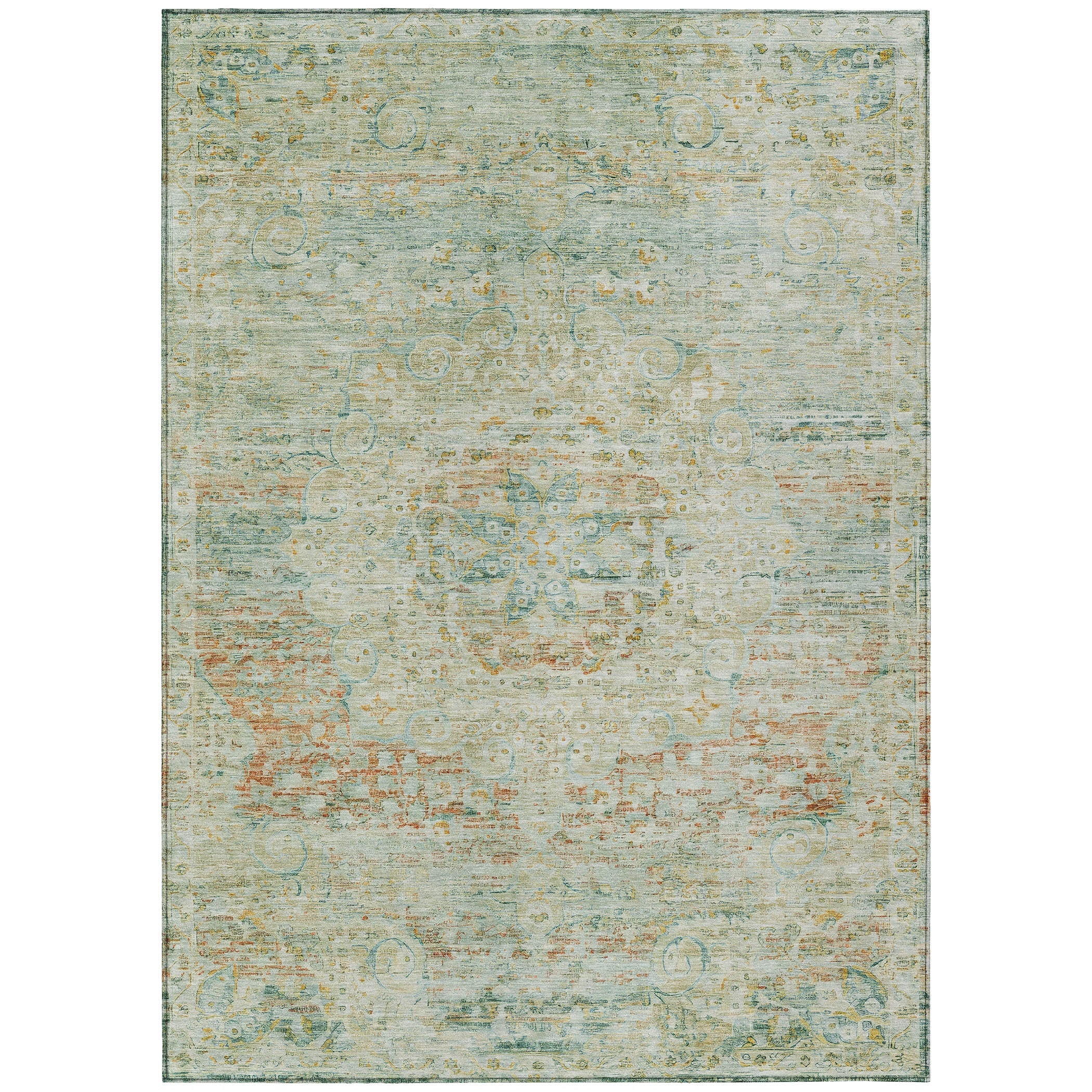 Featuring a center medallion and a vintage distressed border, this traditional rug exudes timeless elegance with its classic design. The detailed medallion and aged border create a refined look that complements various decor styles with a touch of historical charm. UV stabilized for long-lasting use, this rug is suited for both indoor and outdoor environments, preserving its sophisticated appearance over time. The ultra-thin profile ensures easy integration under furniture, and it’s machine-washable for hassle-free care. Family and pet-friendly, this rug combines traditional beauty with modern functionality.